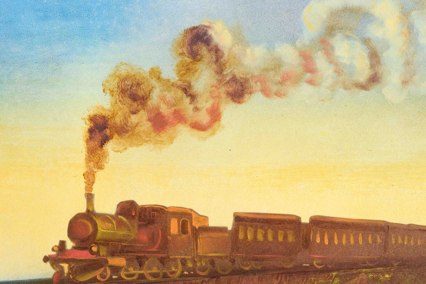 A realistic painting by the Swedish artist Mikael Kvarsebo, executed in 1984. The motif depicts a steam locomotive in the landscape with dramatic smoke against a clear sky, painted in a detailed, naturalistic manner.