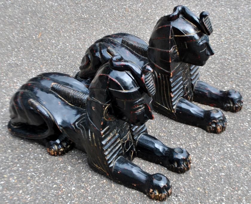 Pair of large decorative black-painted wooden sphinxes, 20th century, Egypt.