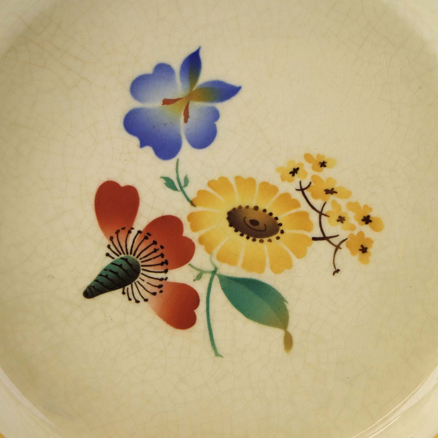 Stel i glat gul fajance med dekoration af farverige og forskelligartede blomster samt med gul og sort kantstreg.