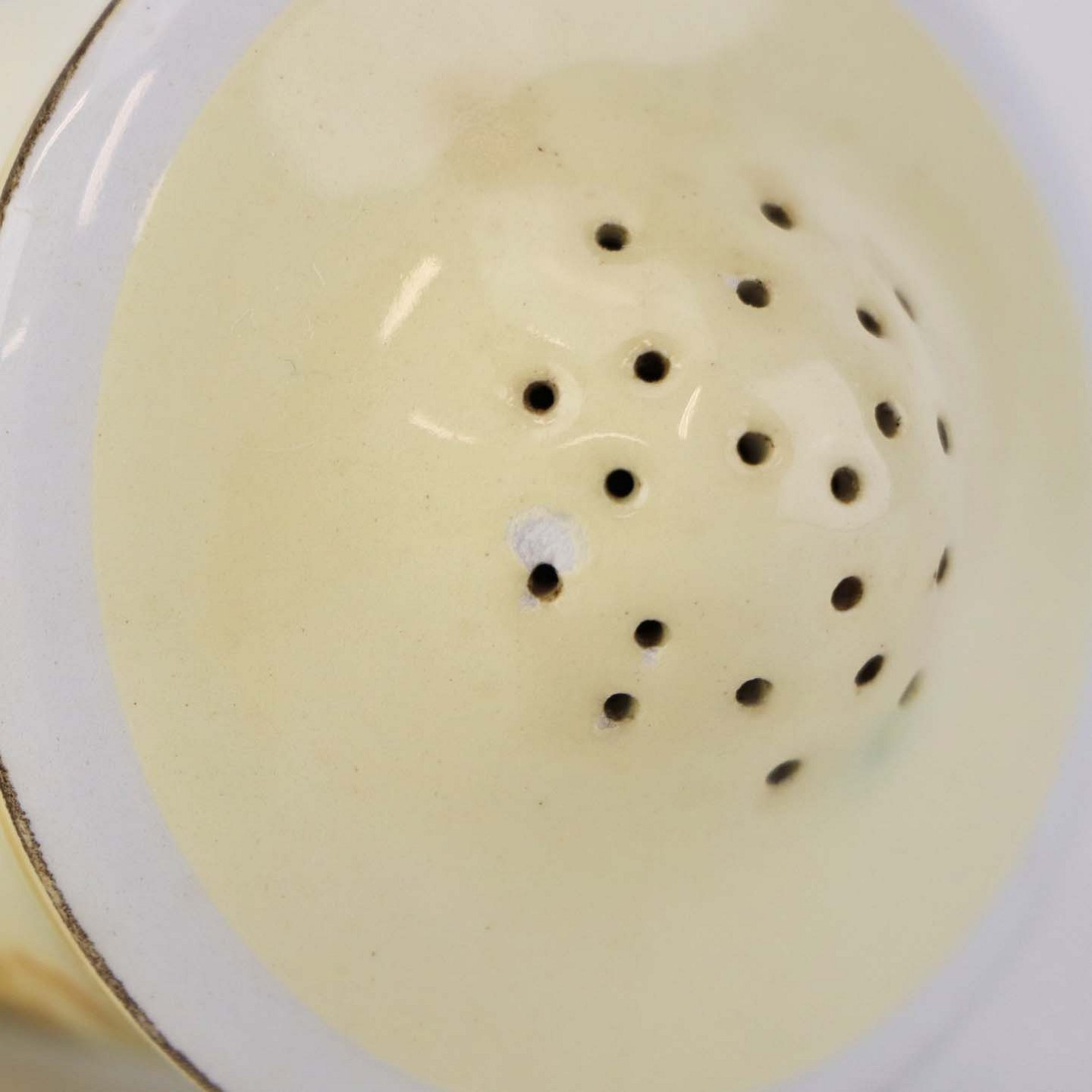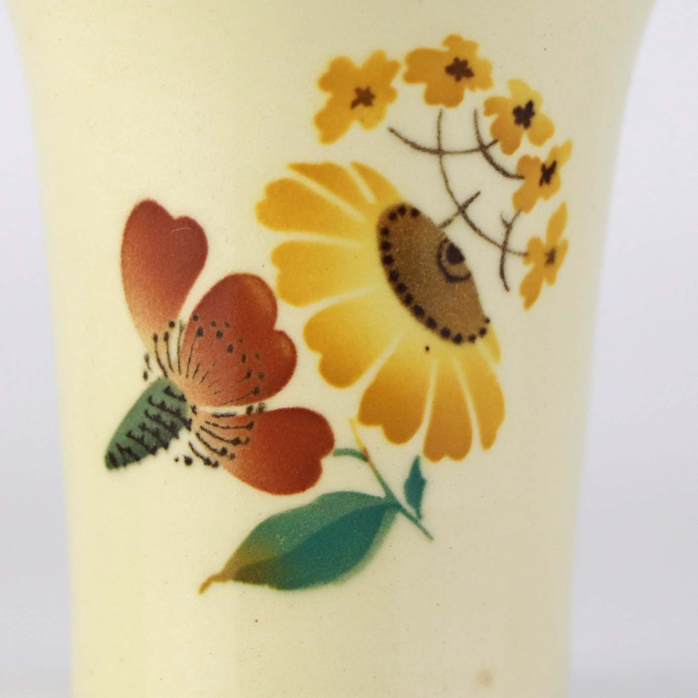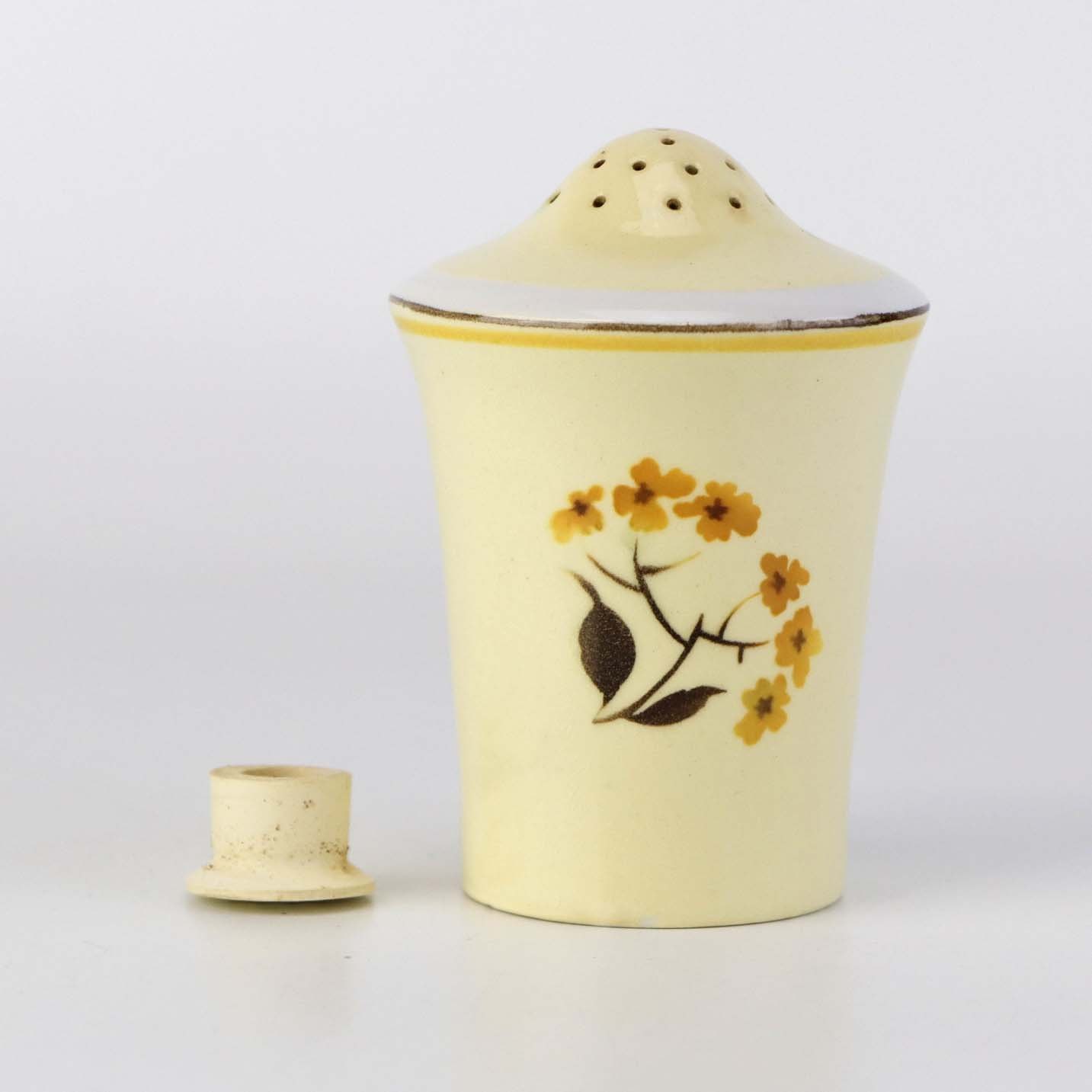 Stel i glat gul fajance med dekoration af farverige og forskelligartede blomster samt med gul og sort kantstreg.