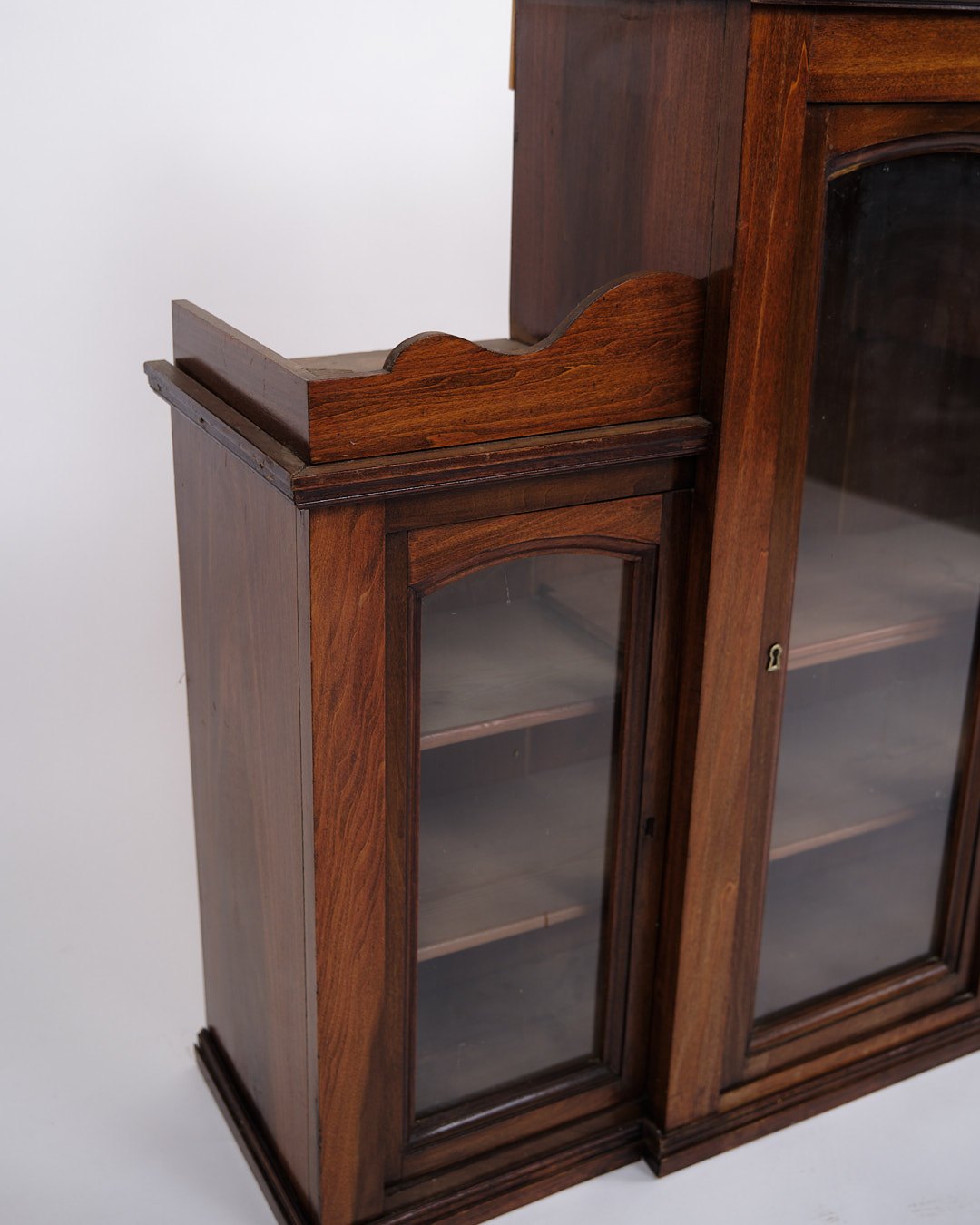 væghængt vitrineskab fra 1890’erne, udført i håndpoleret mahogni. Skabet har klassiske proportioner og fremstår med et tidstypisk design fra slutningen af 1800-tallet, hvor funktionalitet og dekorativt udtryk gik hånd i hånd.