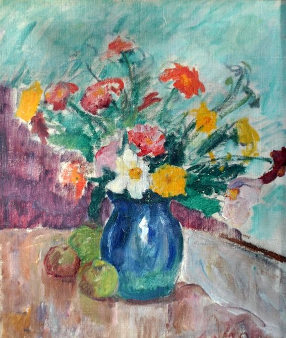 Moe, Andreas Carl (1877 - 1952) Danmark: Vase med blomster på et bord. Olie på lærred. Signeret. 63 x 51 cm.
