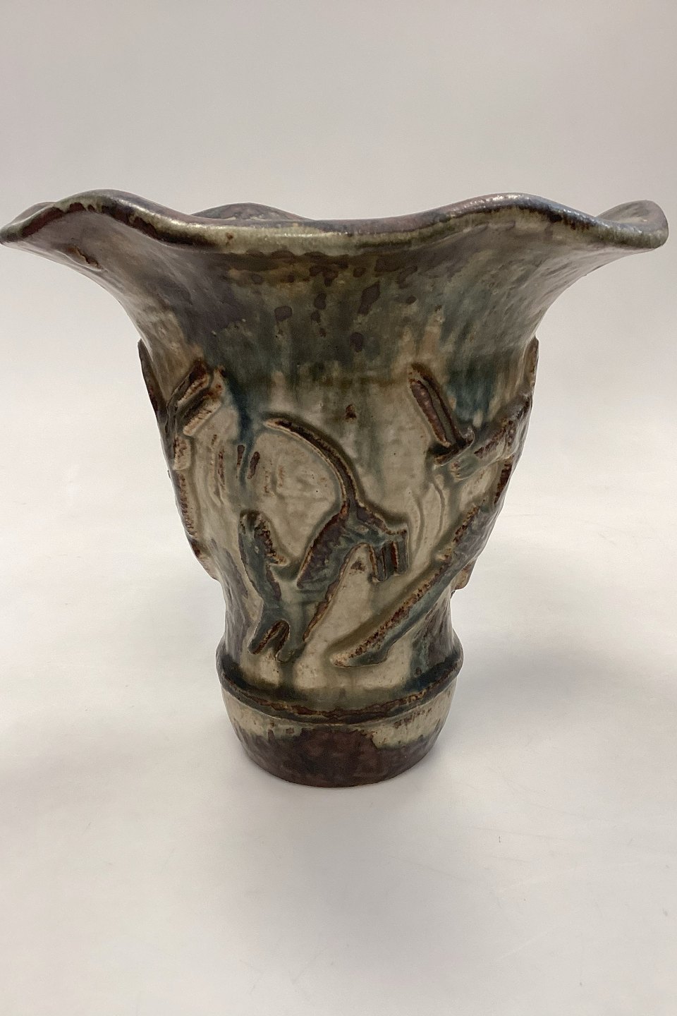 Vase med bølget kant. Motiv af kriger med sværd og skjold, i kamp med vilde dyr. Er i meget fin stand.