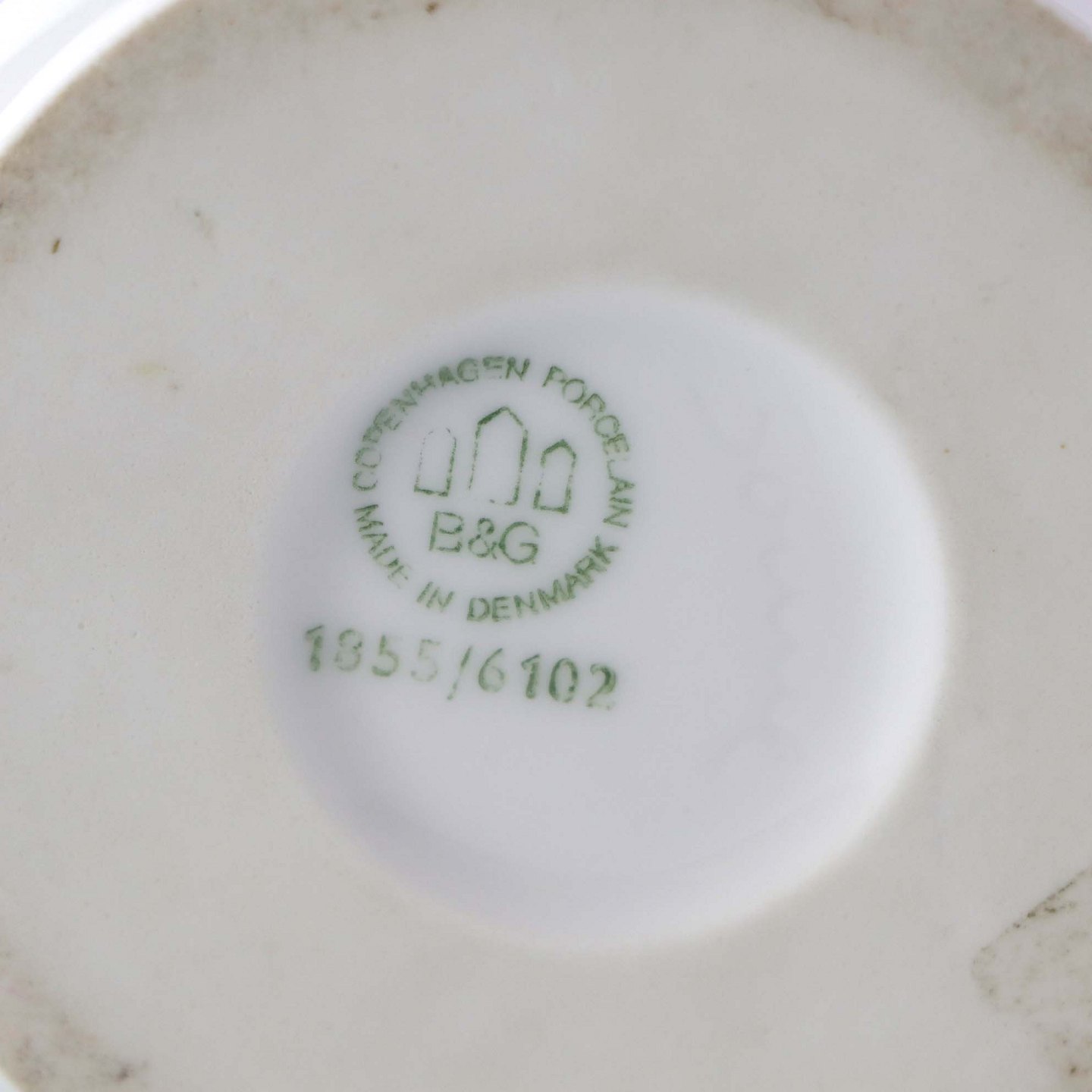 Lille urtepotteskjuler i glat hvidt porcelæn dekoreret med blå striber. Nr. 1855/6102