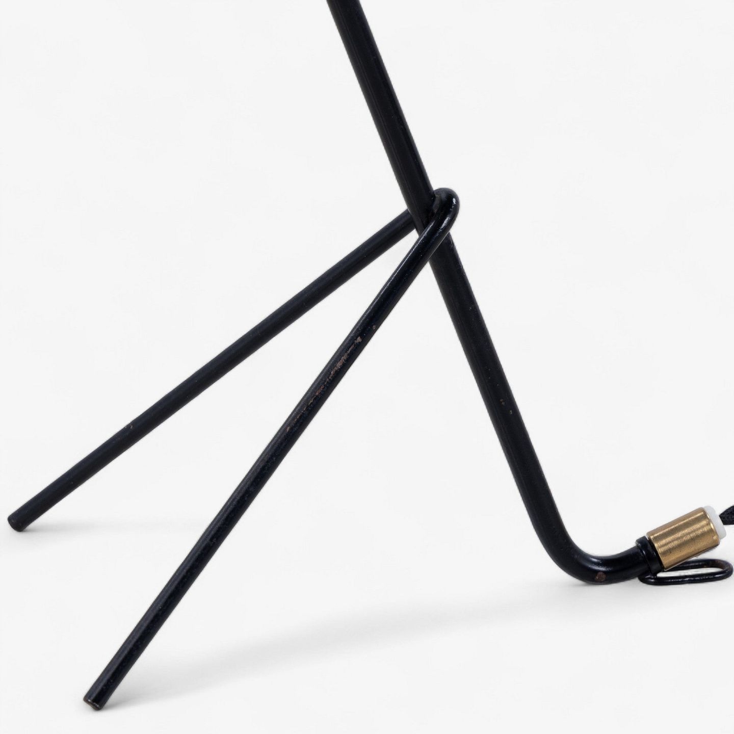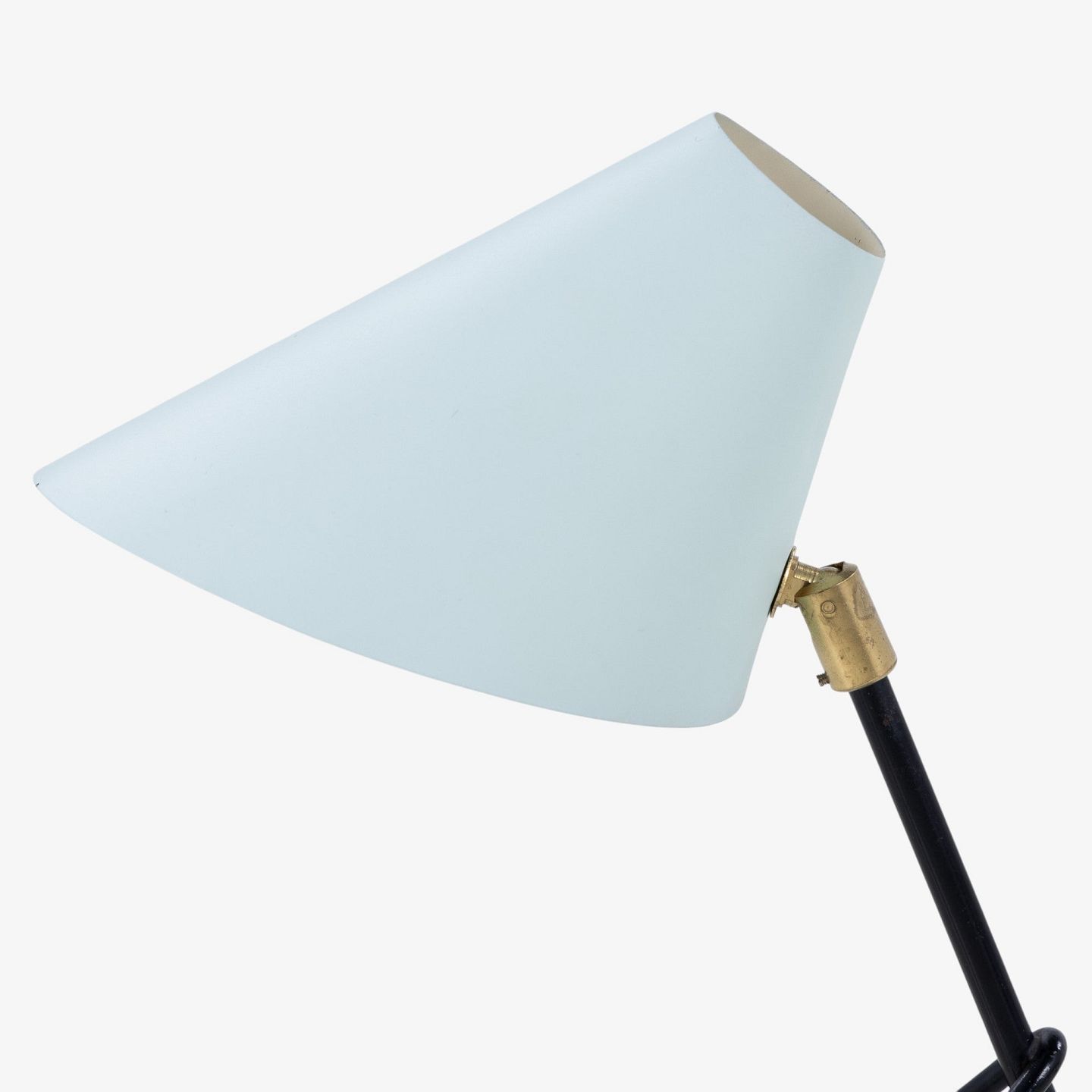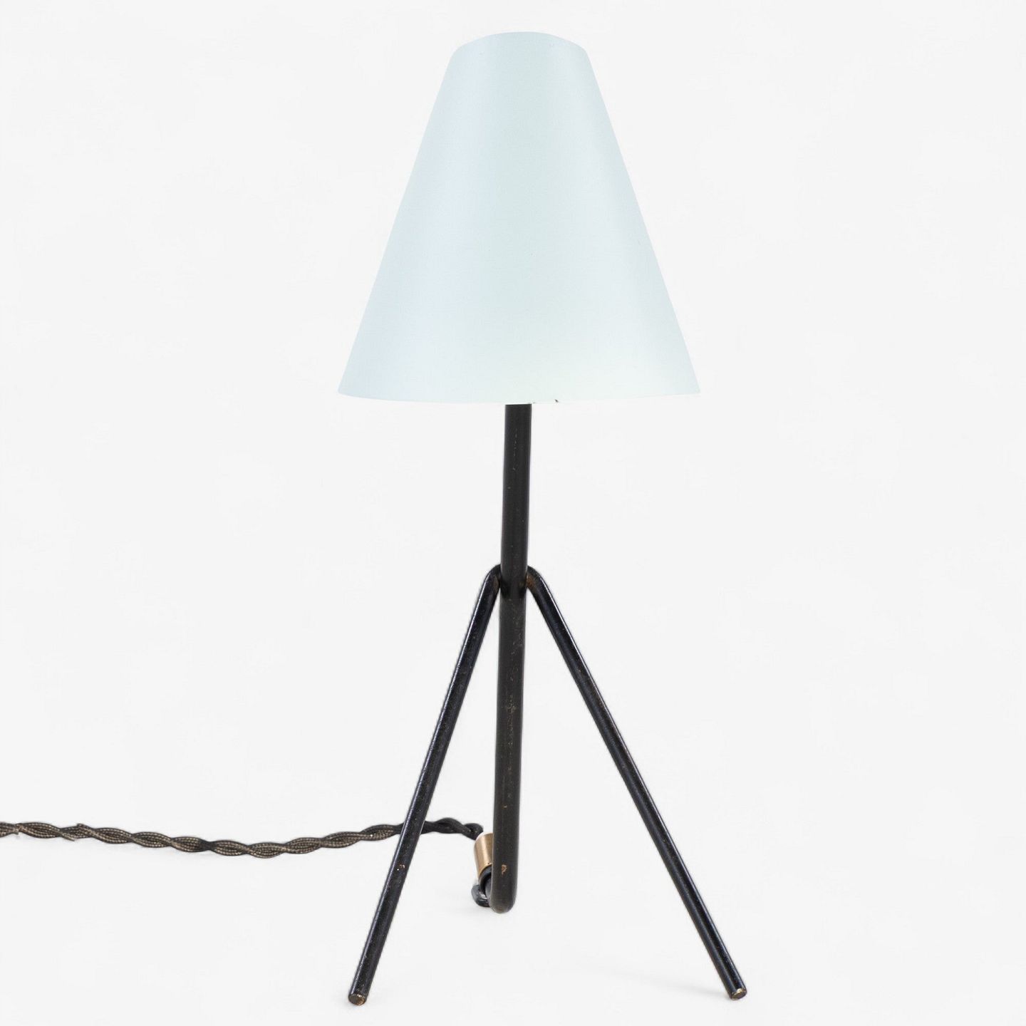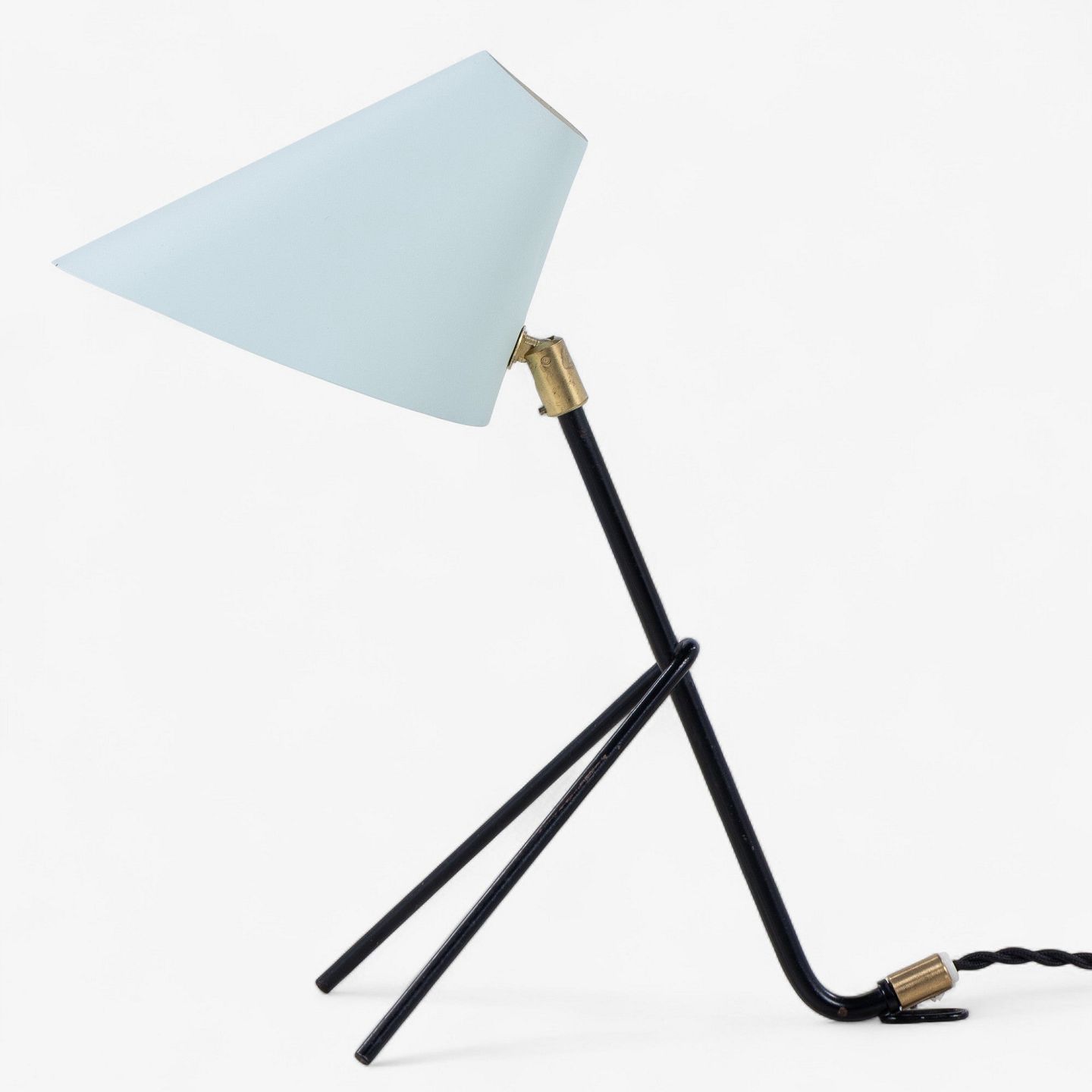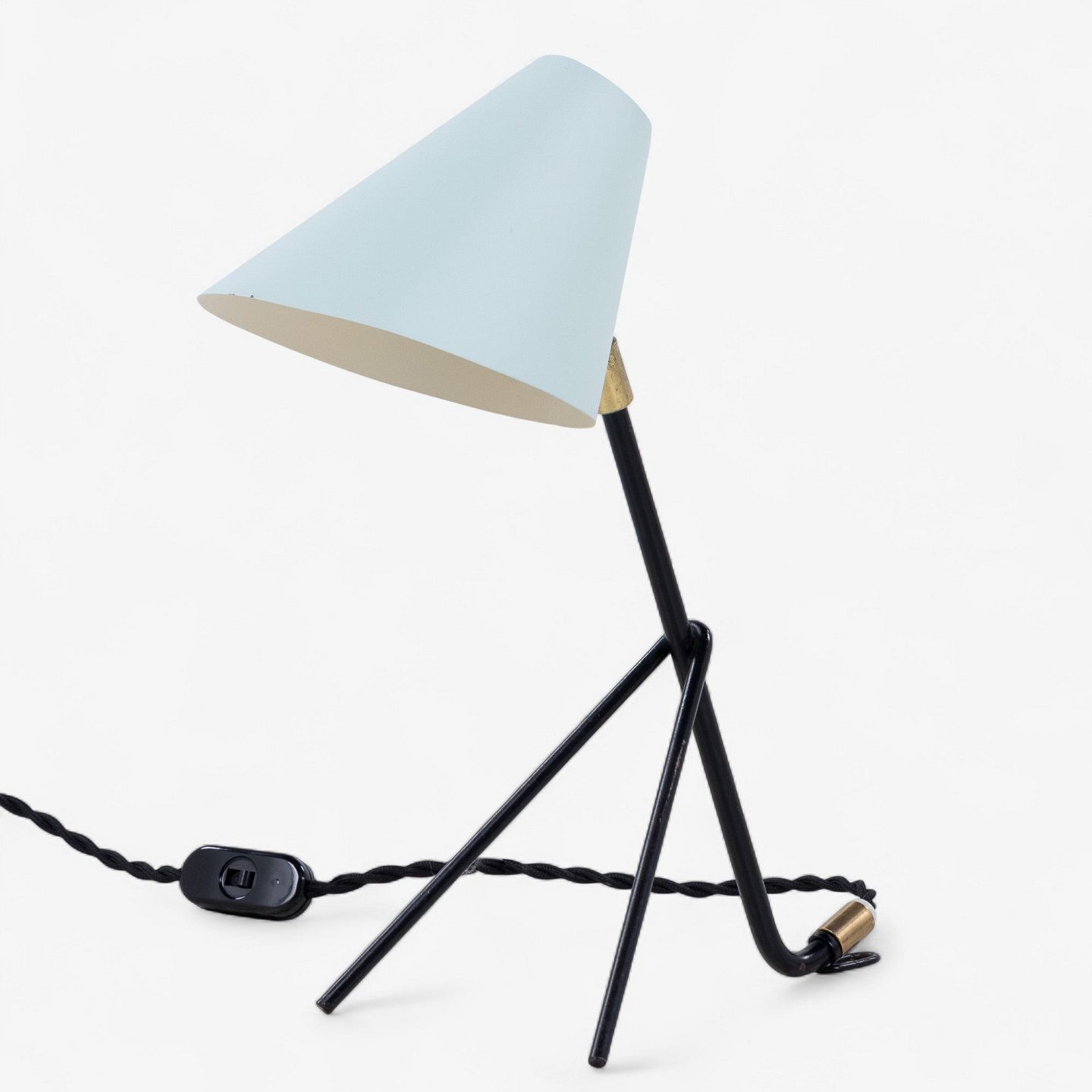 Bordlampe i sortlakeret metal med messing detaljer og blå skærm.