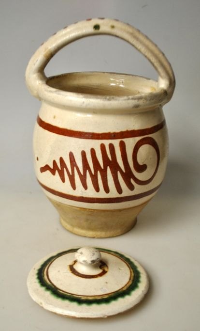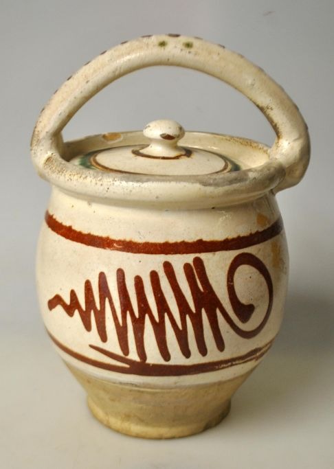 Antik dansk barselspotte i glaseret rødler, 19. årh. Med hvid underglasur og røde og grønne overglasurer. Med låg. H.: 21 cm.