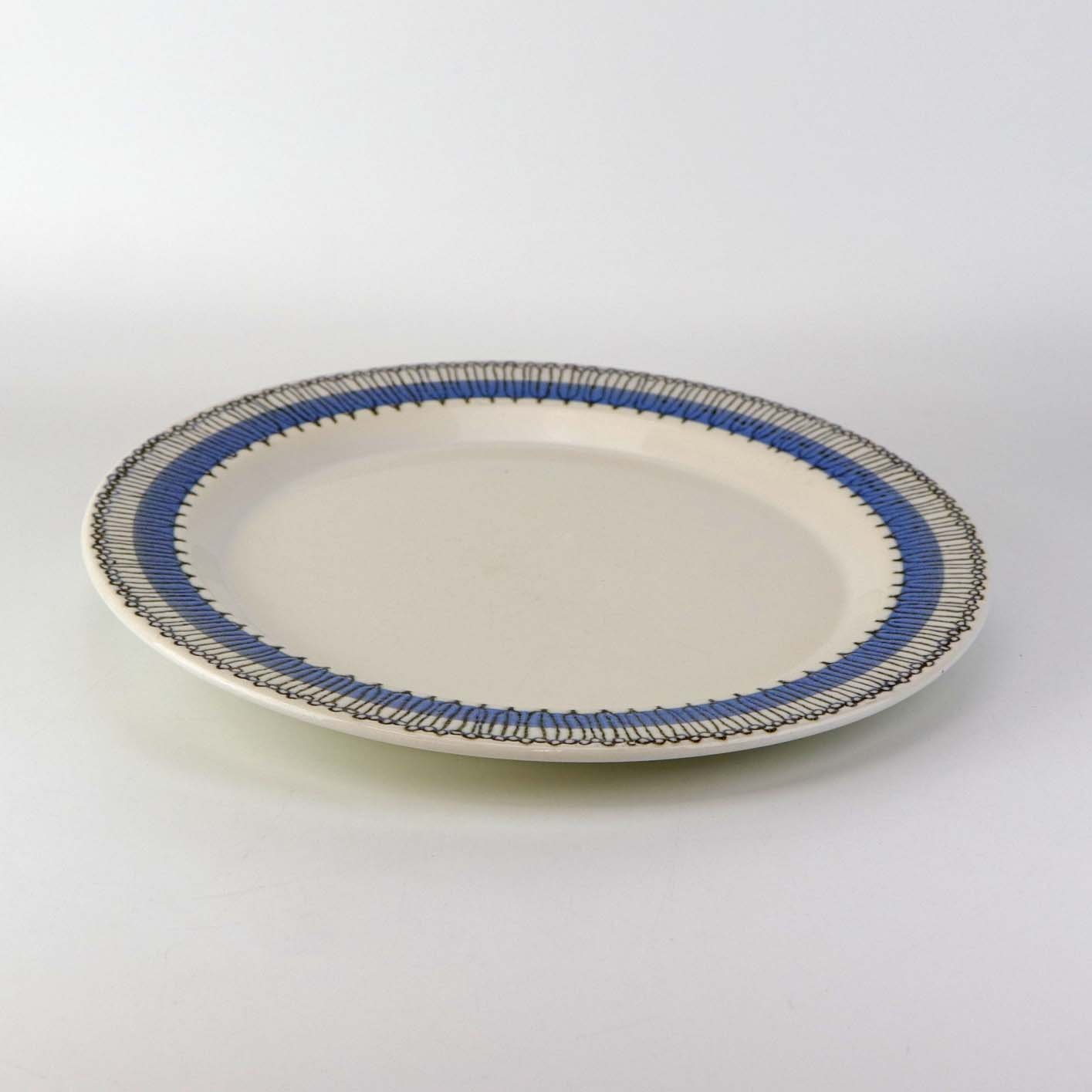 Service i lys fajance dekoreret med abstrakt mønster i sort streg over blå bort.