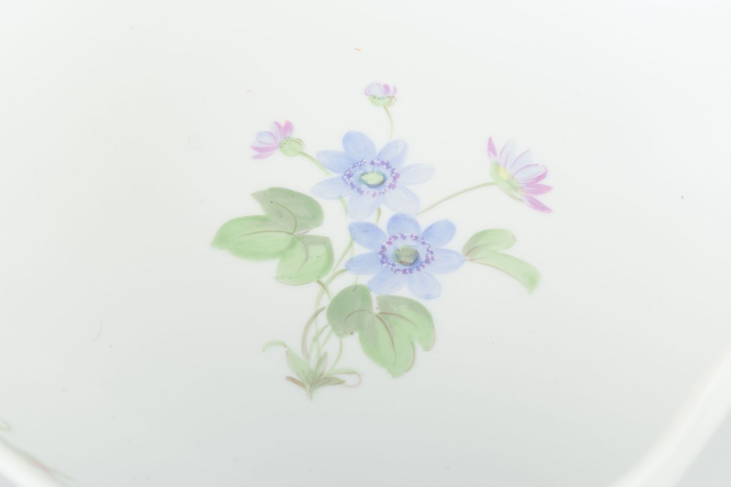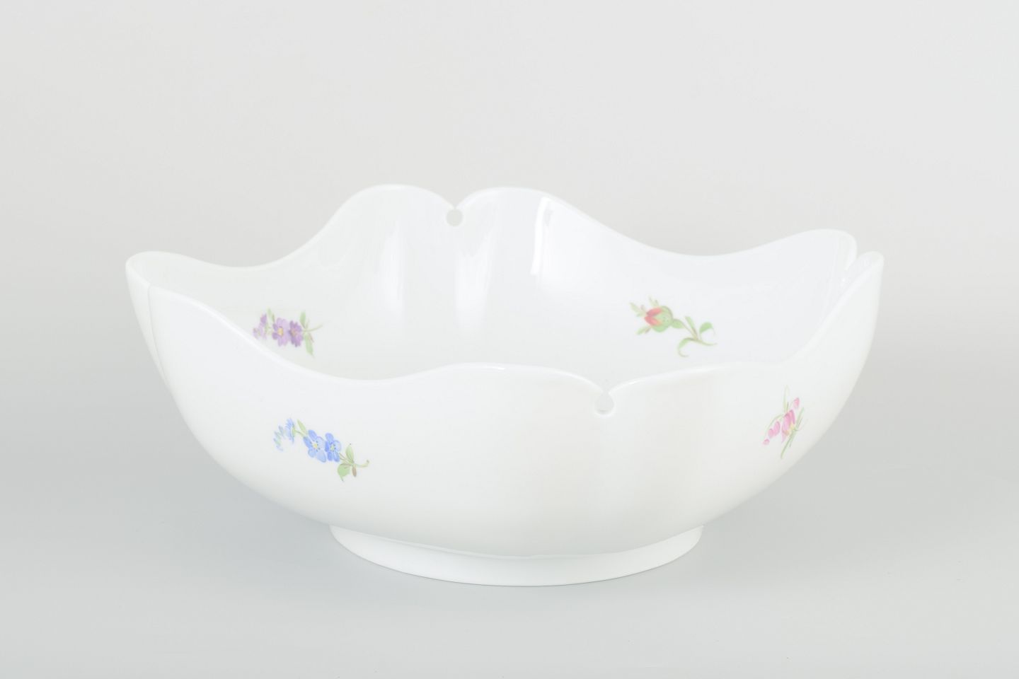Elegant skål i porcelæn med bølget kant og håndmalede blomsterdekorationer i flerfarvet palet. Klassisk Meissen-design med blød form og delikat staffering.