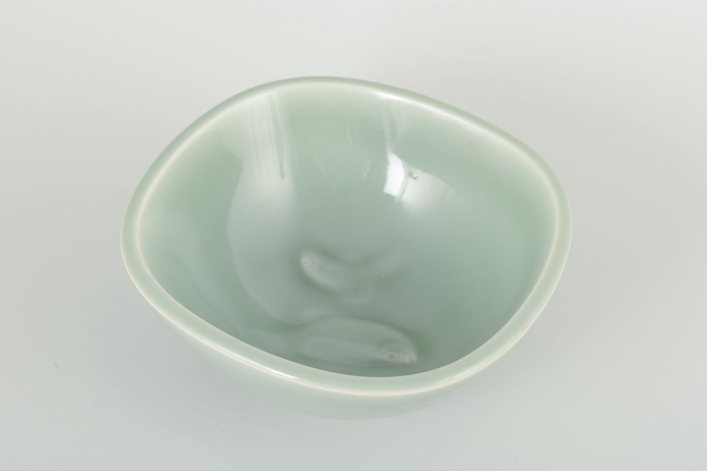 Drejet stentøjsskål med elegant celadonglasur i grønne toner. Enkel og harmonisk formgivning med glat overflade, typisk for Nils Thorssons arbejde i 1940’erne.