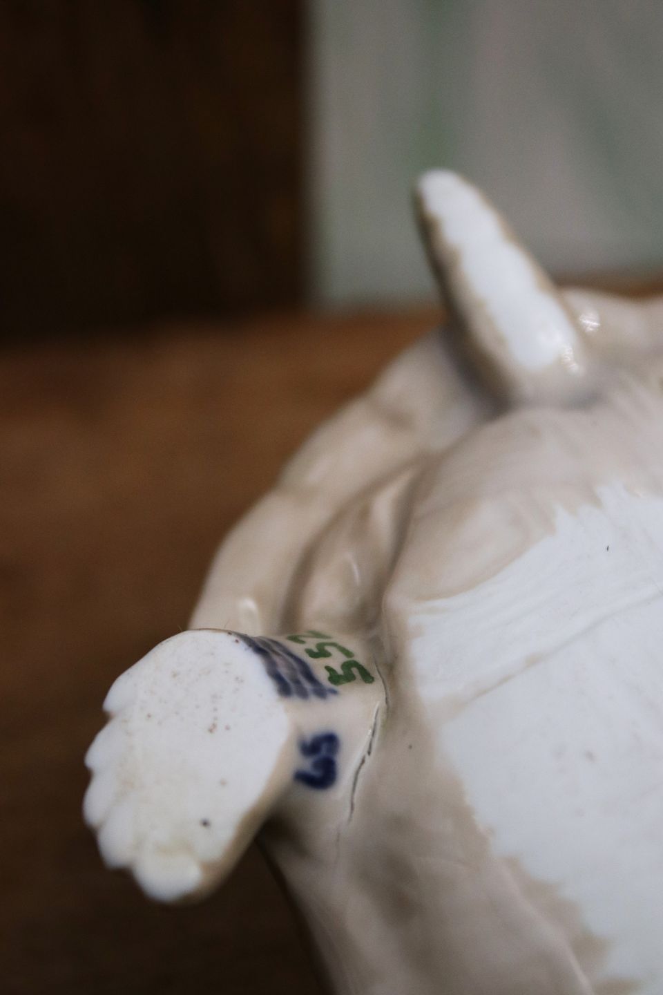 H: 5cm. L: 15cm. B: 10cm. Har en brændings revne på undersiden ved bagbenet , se extra billeder.
