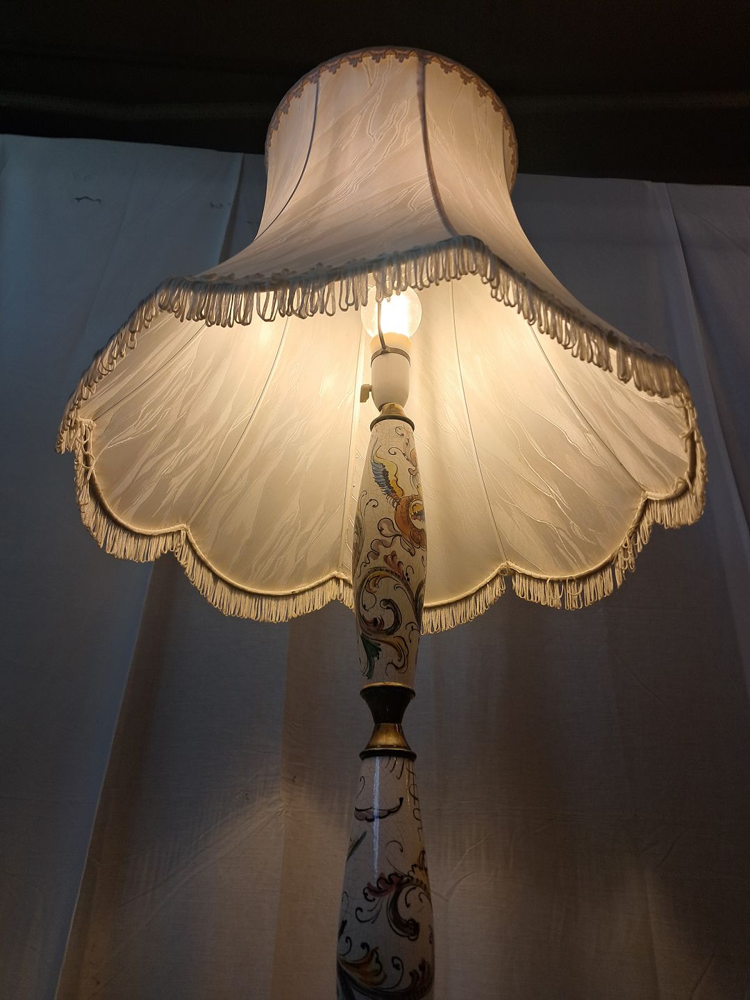 Gulvlampe i metal og pocelæn med skærm, fra 1980erne.
