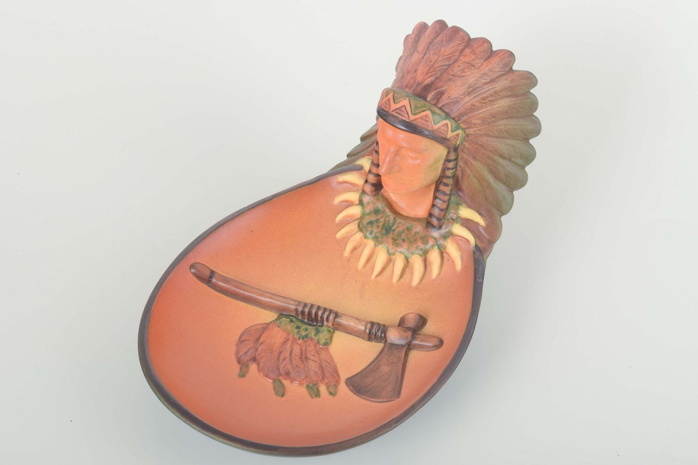 Dekorativ skål med reliefformet buste af en nordamerikansk indianer iført fjerprydet hovedbeklædning og halskæde af kløer. Glasur i dæmpede grønne, brune og orange nuancer. Et karakteristisk figurativt arbejde fra Ipsens Enke, 1920’erne.