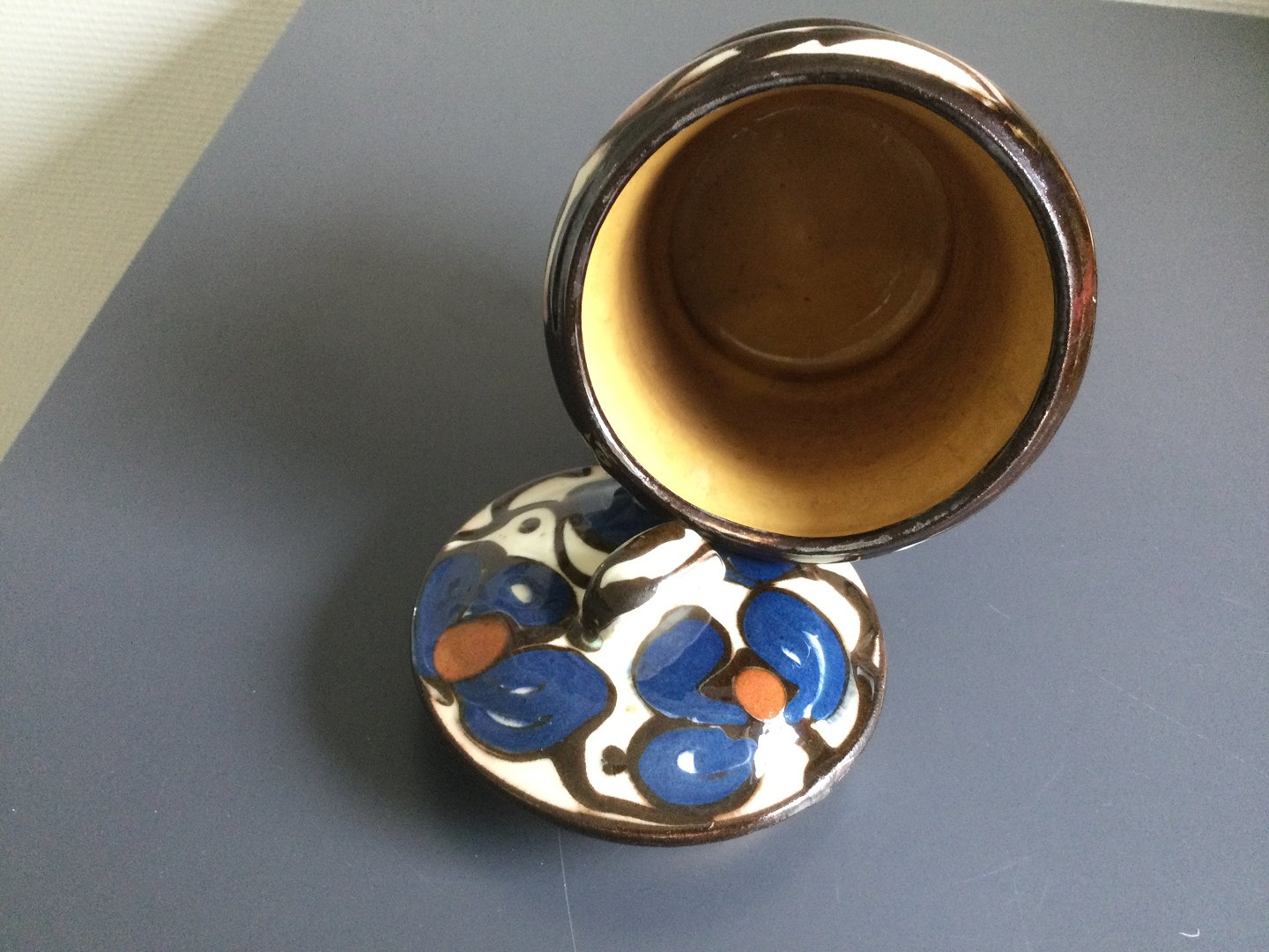 Dekoreret i blåt og brunt med kohornsteknikken.