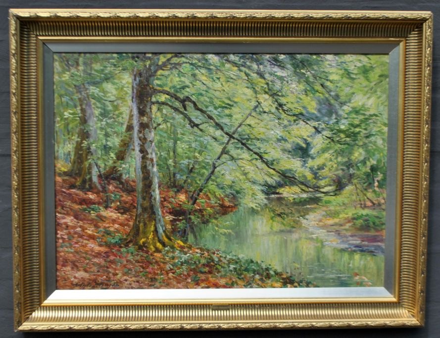 Gyde Petersen, Hans (1862 - 1943) Danmark: Et åløb, forår. Olie på lærred. Signeret. 54 x 75 cm.