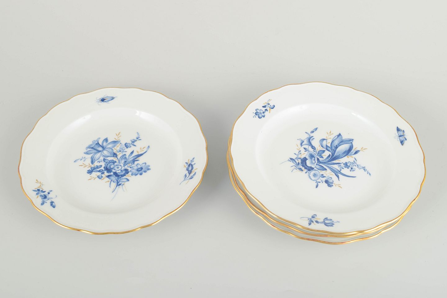 Hånddekoreret porcelæn med håndmalede blå blomsterdekorationer og forgyldte stafferinger langs kanten. Klassisk let bølget form.