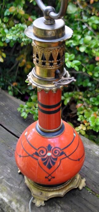 Fransk bordlampe, 19. årh. Tidligere petroleumslampe, omgjort til el. Bronze og korpus i rødt porcelæn med dekorationer. H.: 59 cm.
