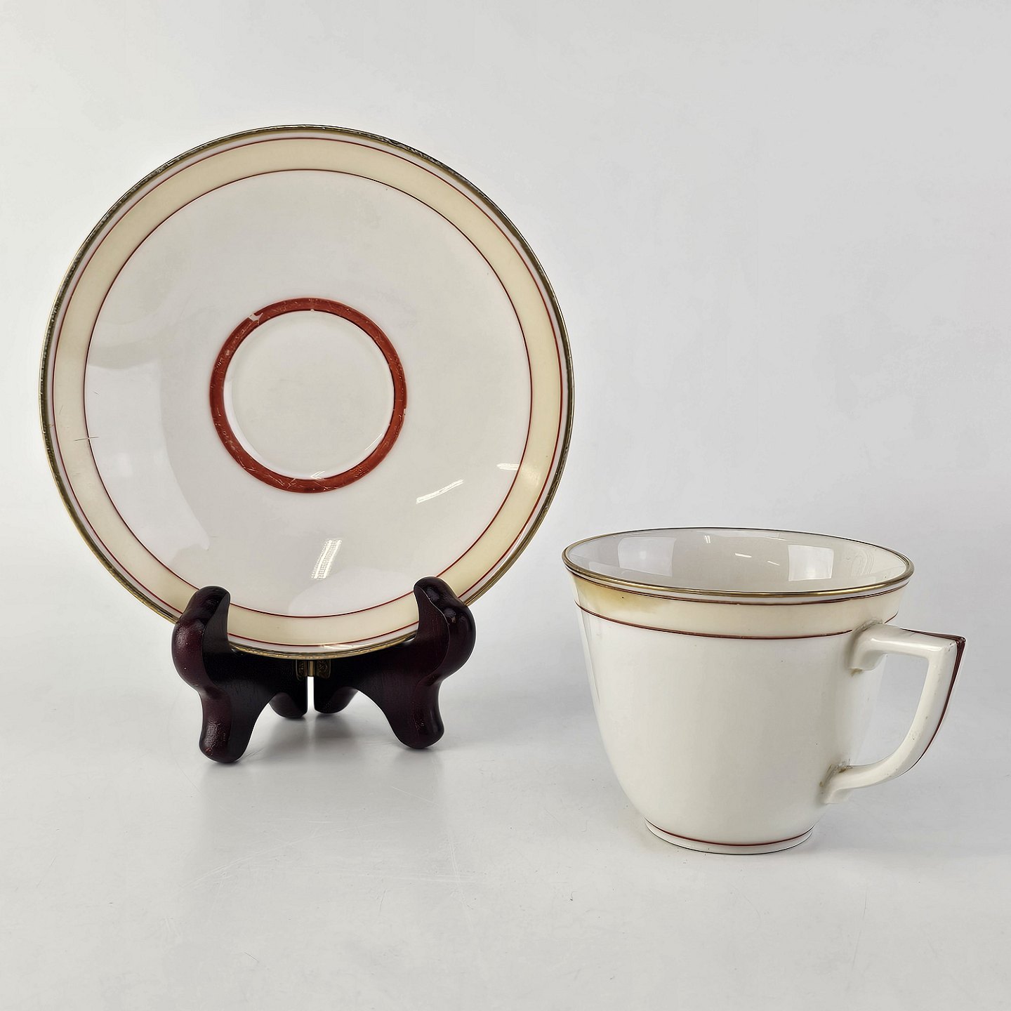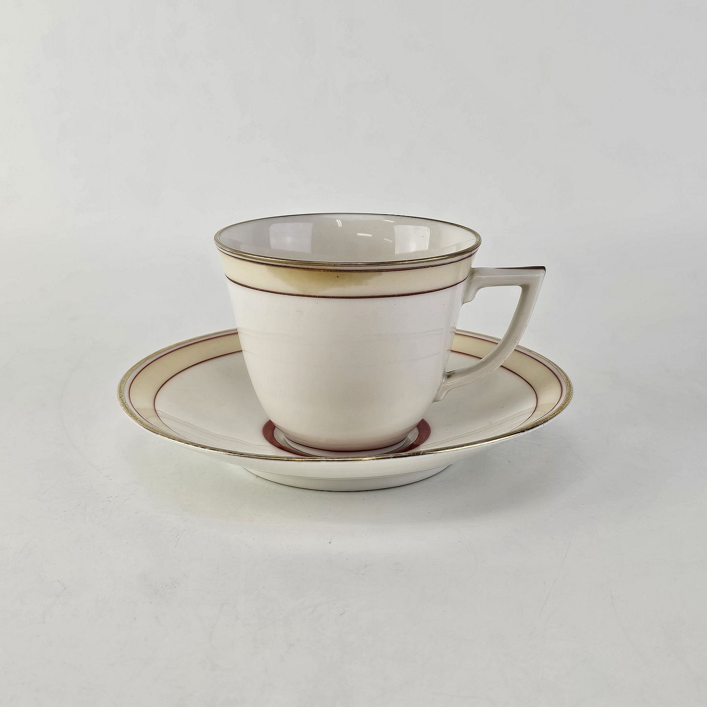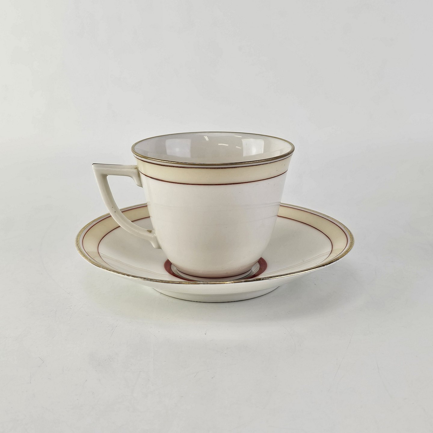 Service i glat hvidt porcelæn pyntet med dekoration i beige, brændt orange og gylden streg.