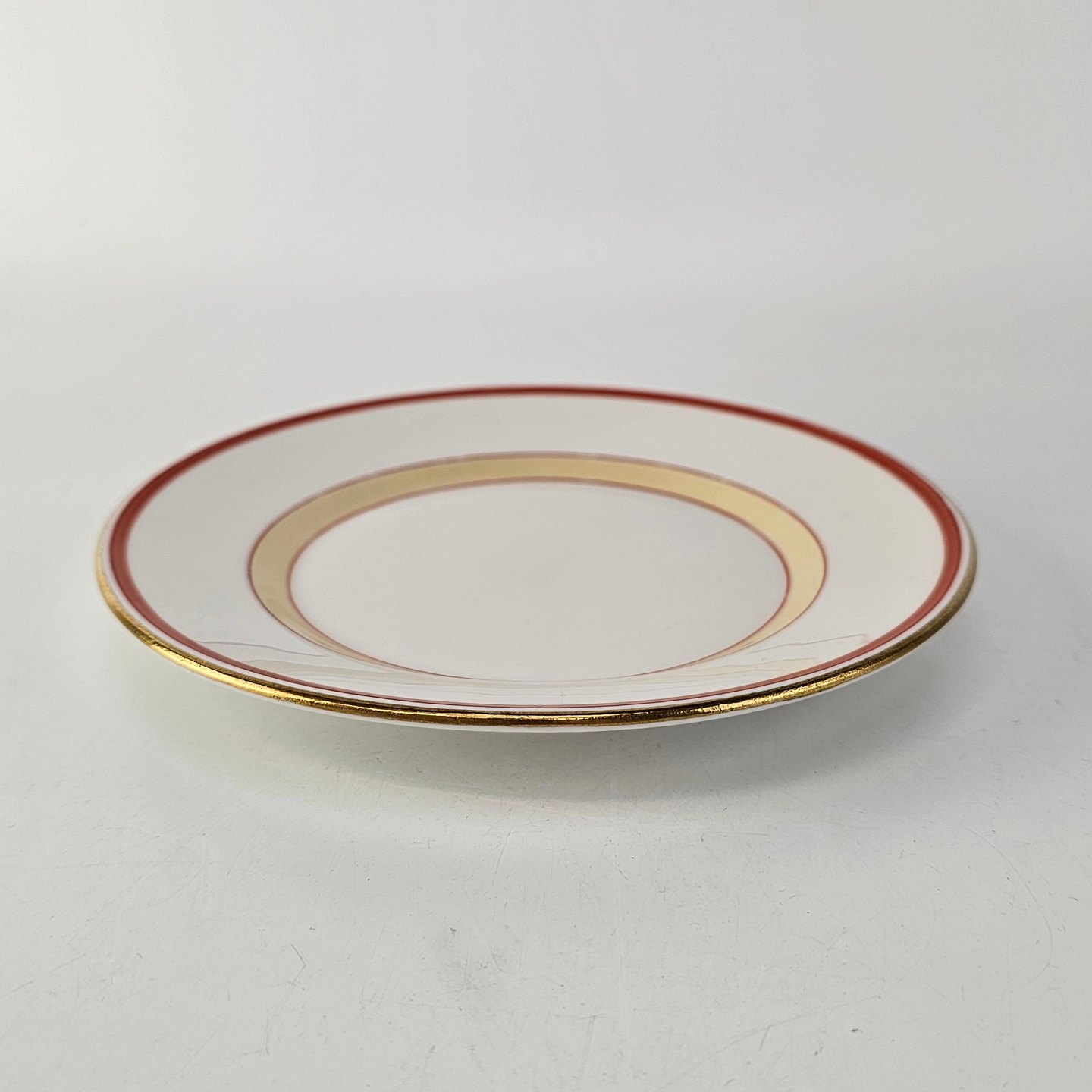 Service i glat hvidt porcelæn pyntet med dekoration i beige, brændt orange og gylden streg.