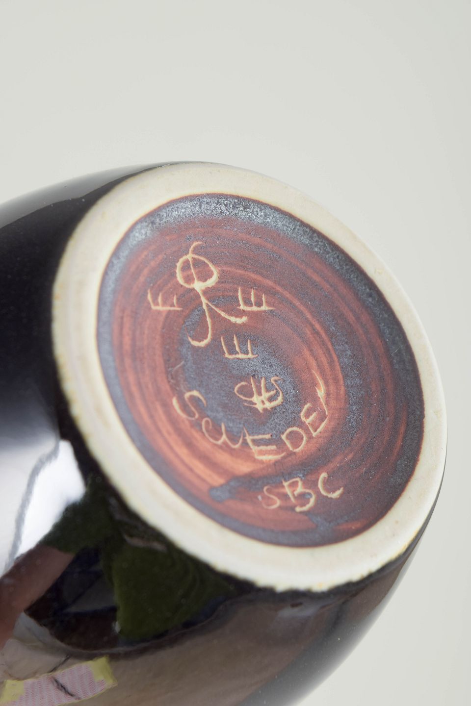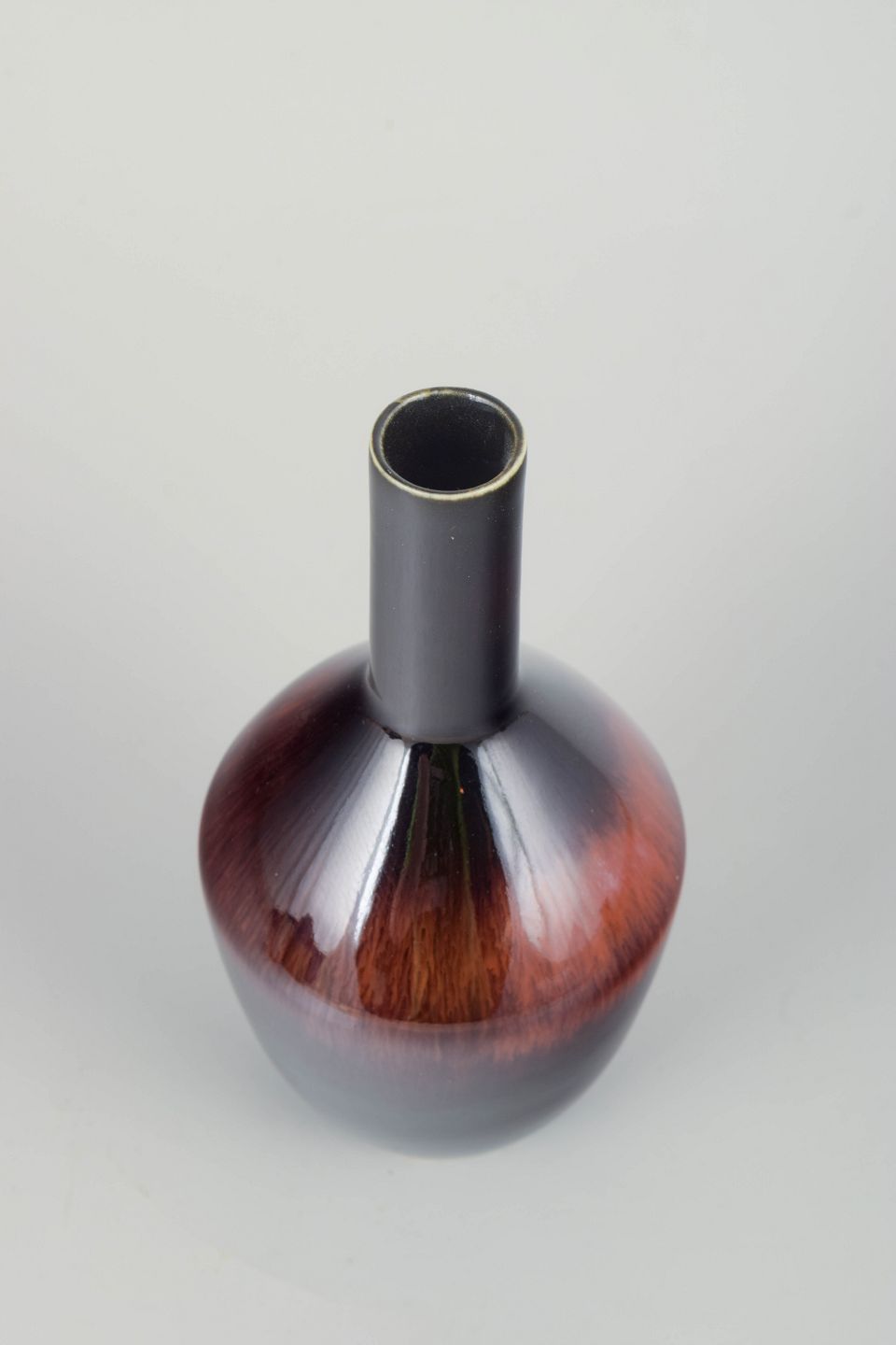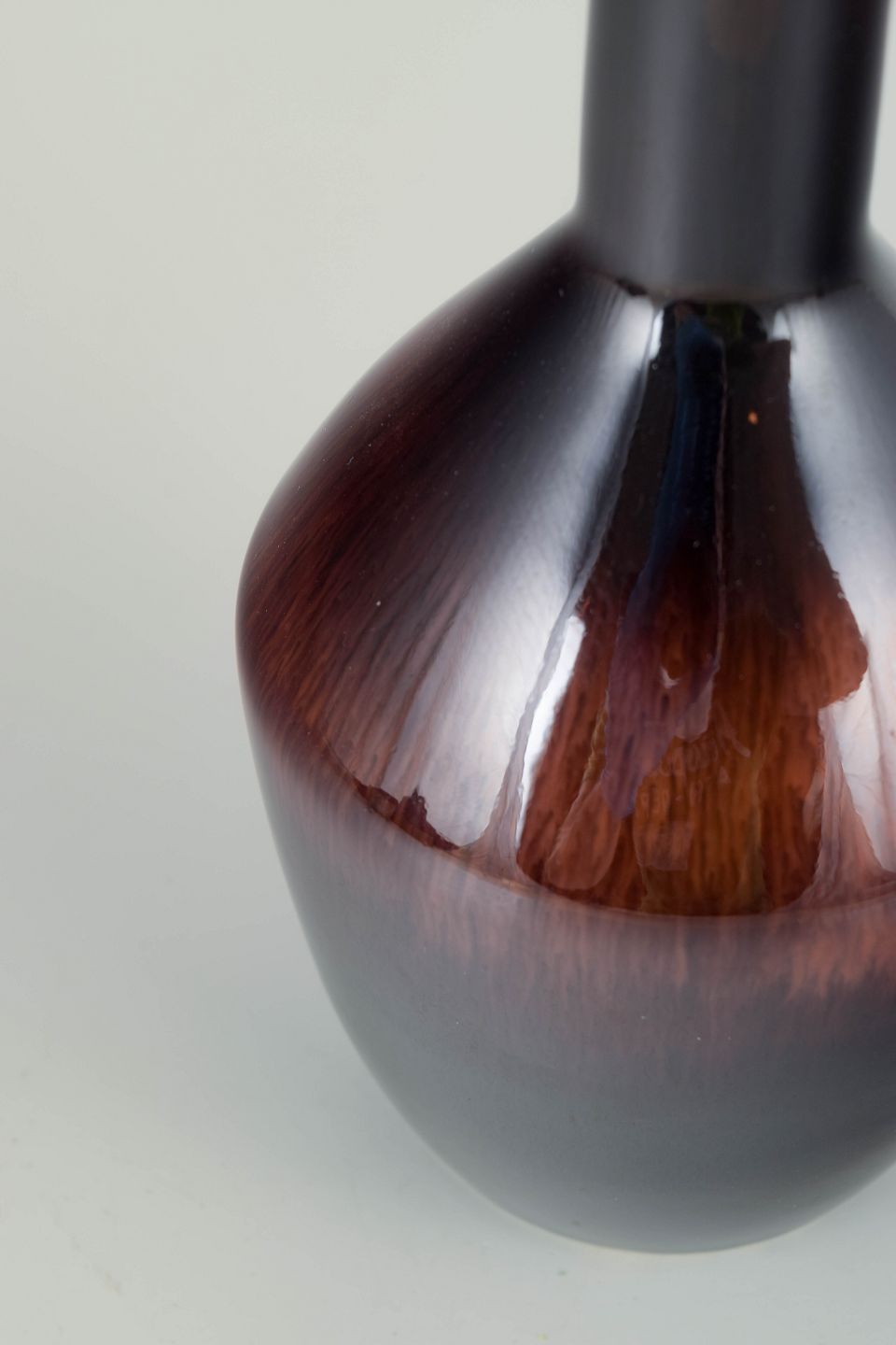 Slank cylindrisk hals og afrundet korpus med dyb tofarvet harepels-glasur i brune og næsten sorte nuancer — et raffineret eksempel på Stålhane’s mest klassiske moderne formsprog.