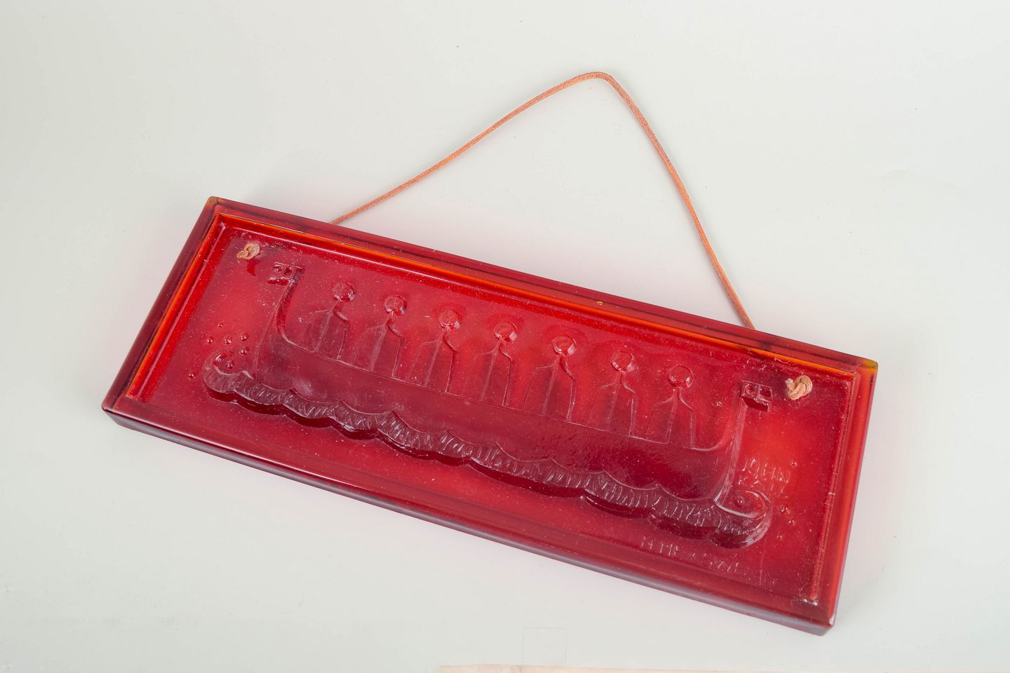 Rectangular wall hanging in deep red/orange glass, signed John Käll in mould and marked ELME SWEDEN. Stylised Viking longship with crew in procession and rolling wave motif.