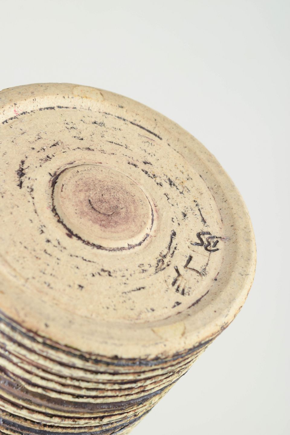 Cylindrisk form med hånddrejet horisontal reliefstruktur og mørk glasering indvendigt. Signeret “BS” under bunden.