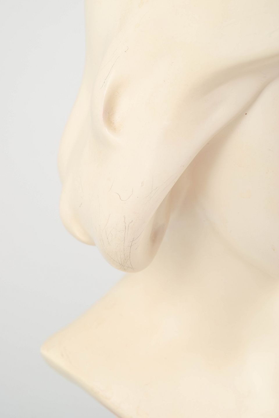 Hvidpatineret gipsbuste af ung pige på massiv træfod med metalskilt “PÅSKLILJAN”. Klassisk naturalistisk formsprog med blød, mat overflade.