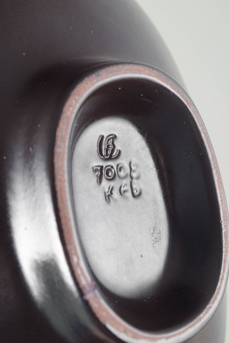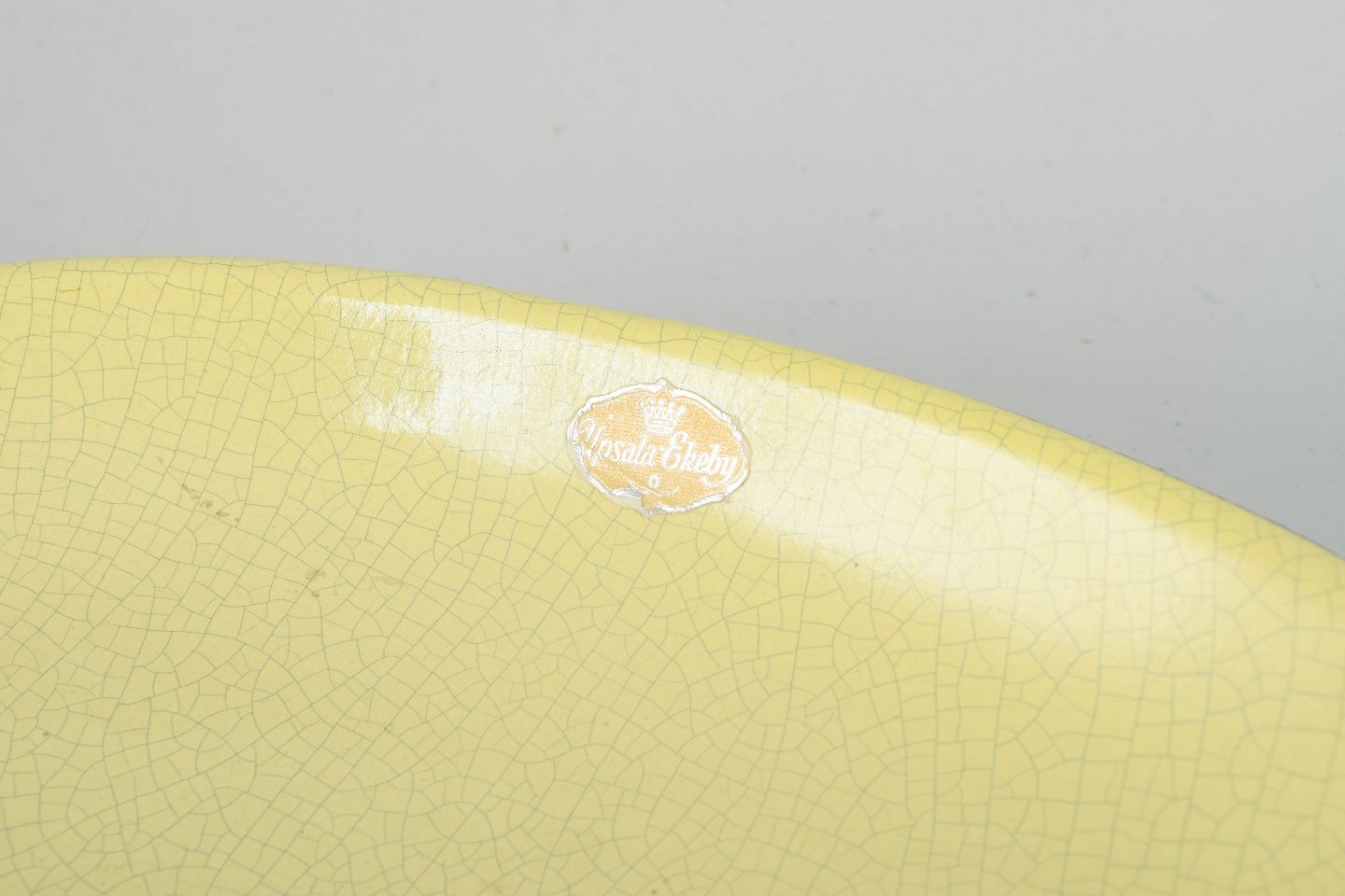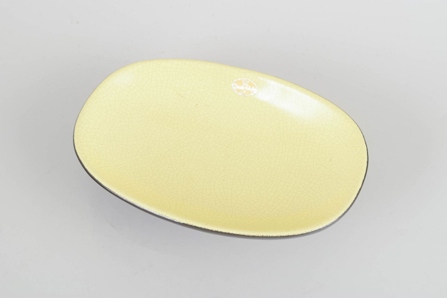 Ovalt stentøjsfad med forhøjet fod, blank gul glasur med fin krakelering og mørk chokoladebrun underside.