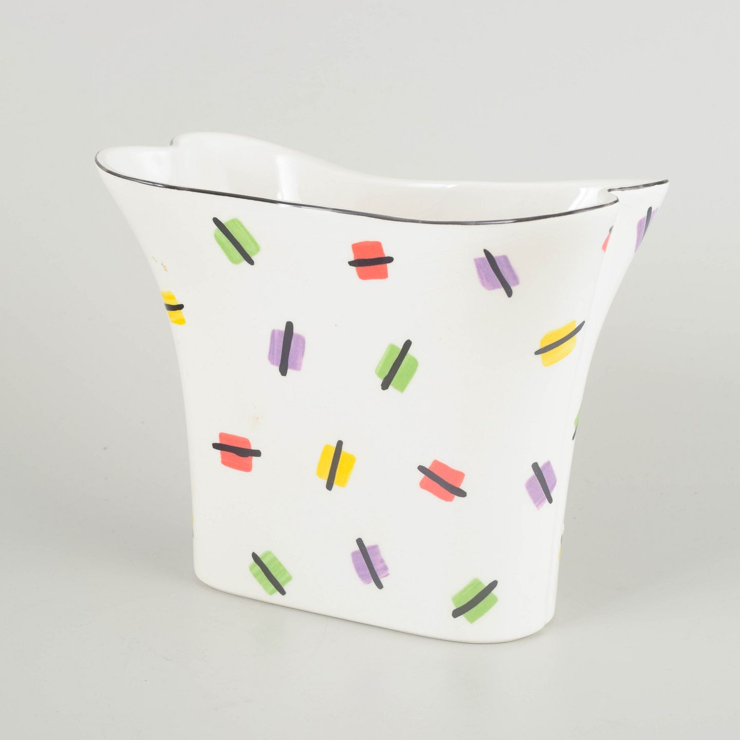 Faiencevase i karakteristisk Memphis-stil med bølgende form og håndmalet dekoration i klare farver – grøn, lilla, gul og rød – på hvid baggrund med sort kant. Et livligt og legende eksempel på Rönndahls design for Gustavsberg i 1980’erne.