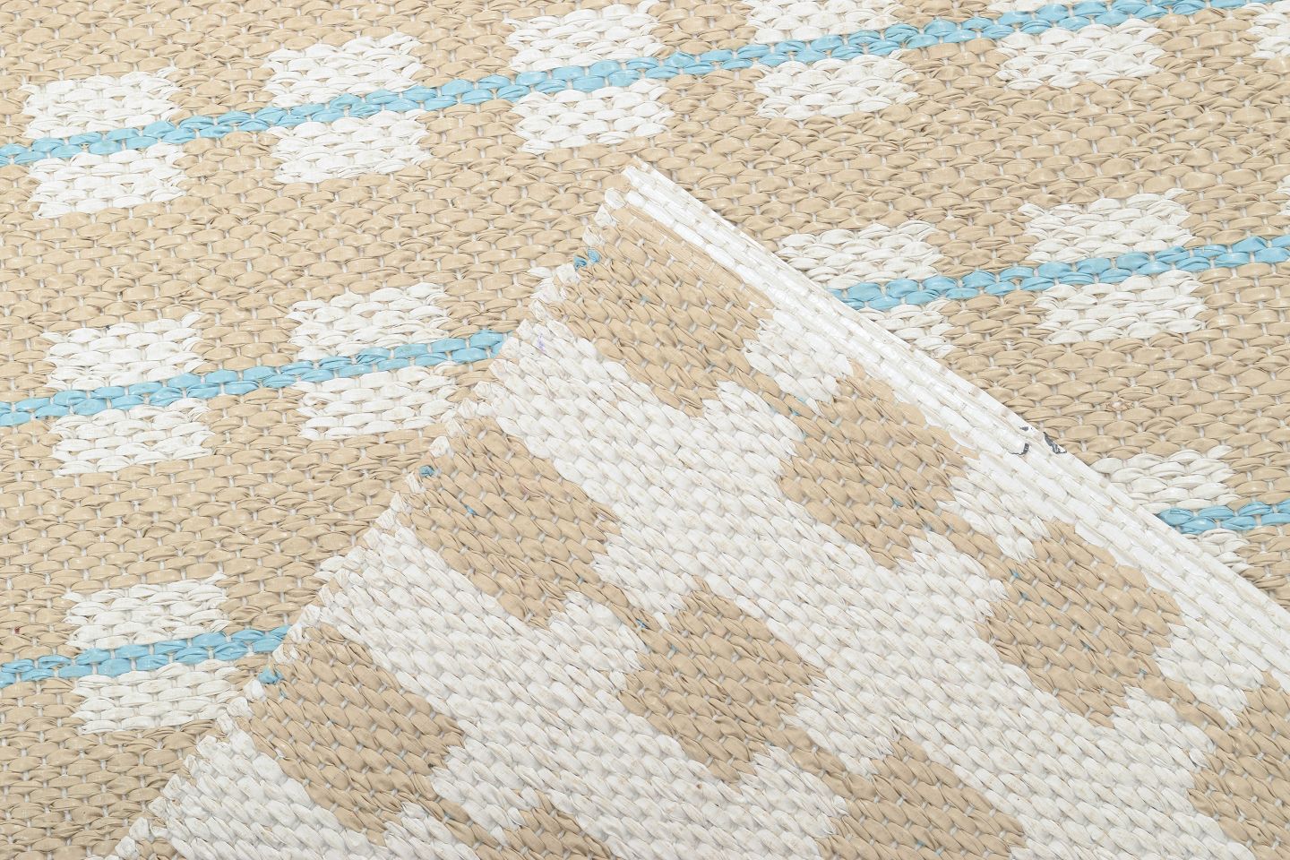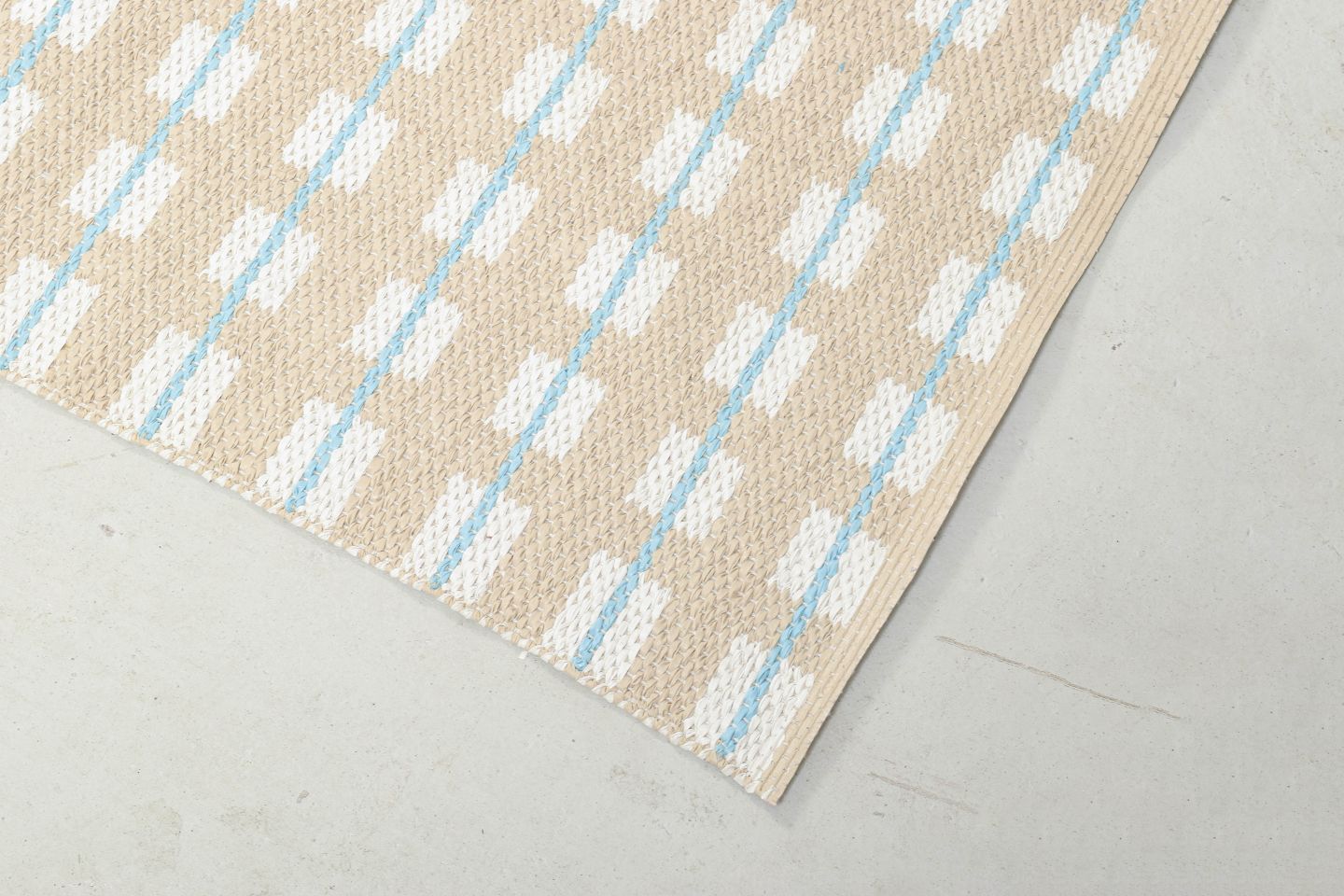 Rektangulær bordløber i vævet plast med grafisk mønster i beige og lyseblå nuancer, typisk for 1970’ernes funktionelle og farveglade interiørdesign.