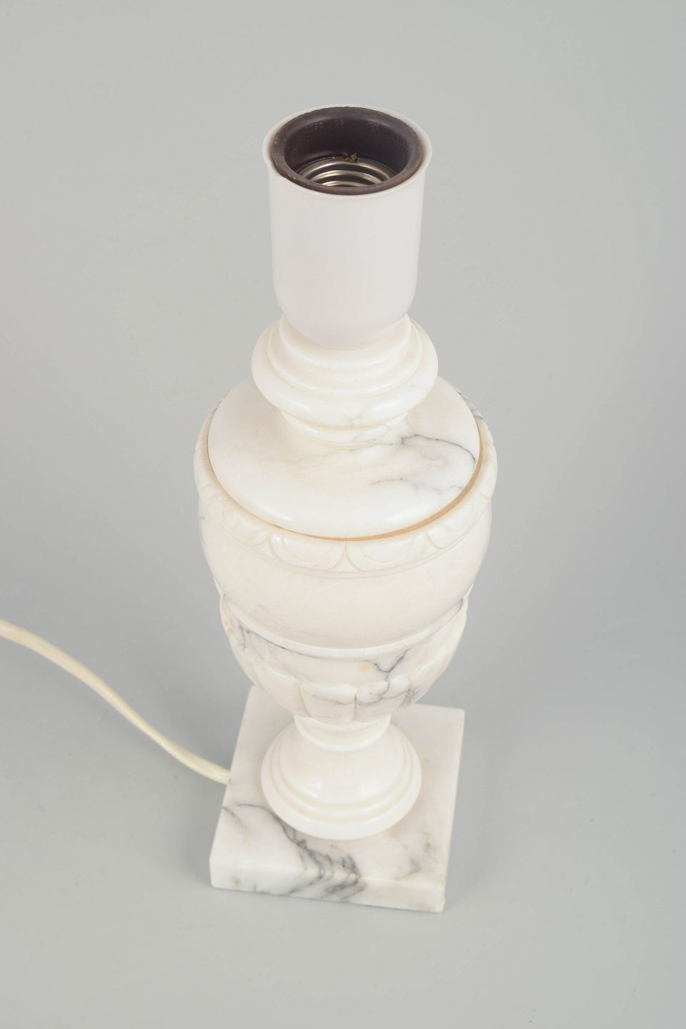 Klassisk urneformet bordlampe udført i alabast med firkantet fod og dekorativ guldfarvet ringdetalje. Et elegant eksempel på italiensk håndværk, der kombinerer klassiske proportioner med alabastens naturlige translucens.