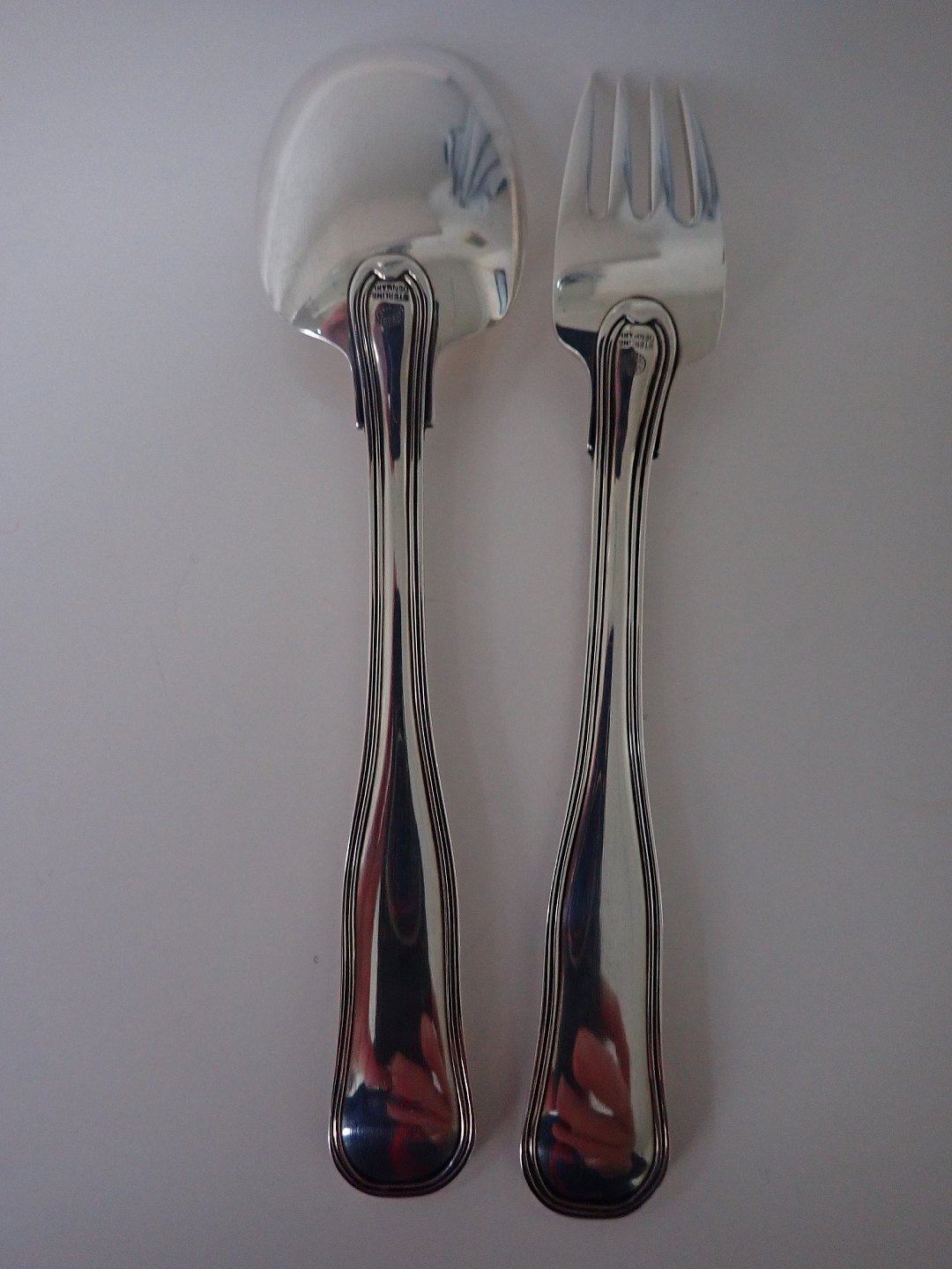 Georg Jensen -dobbeltriflet barnesæt med ske og gaffel i sterling sølv. Efter 1945. Samlet vægt: 79,5 gram. Længde på ske: 15,4 cm. Længde på gaffel 15,2 cm. I fin nærmest ubrugt stand.