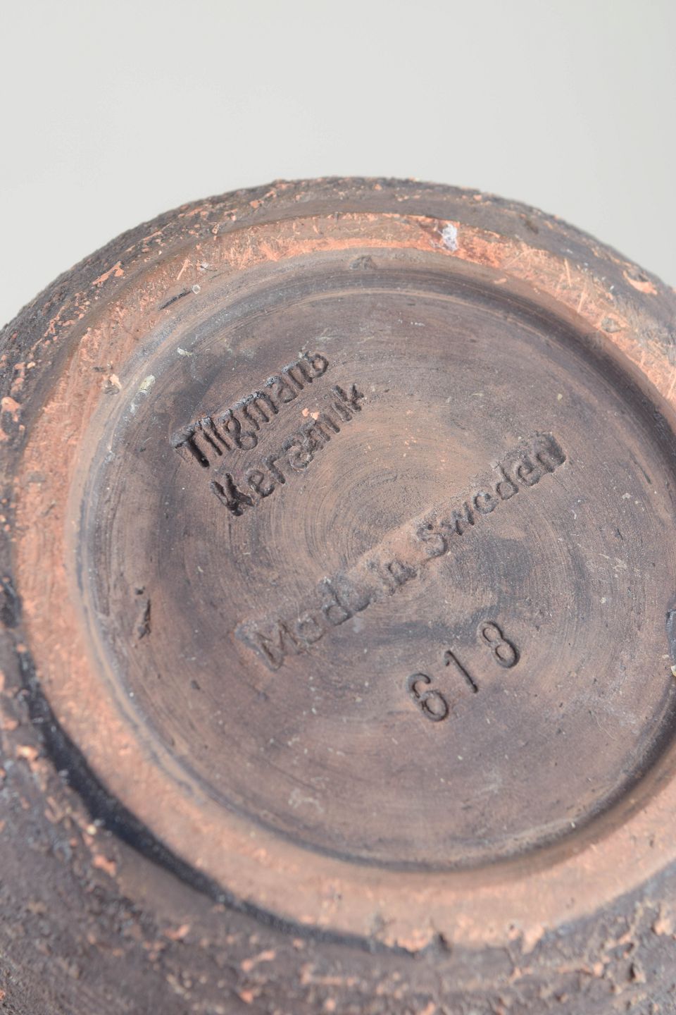 Tilgmans Keramik i Göteborg var aktiv fra 1940’erne til 1970’erne og blev kendt for sine dekorative vaser og figurer med reliefmønstre og glasurindlæg i stærke farver. Produktionen omfattede både seriefremstillede og hånddekorerede stykker, ofte signeret af individuelle dekoratører. Værkets karakteristiske rustikke overflader og farver gør Tilgmans til et markant navn i svensk midcentury-keramik.
