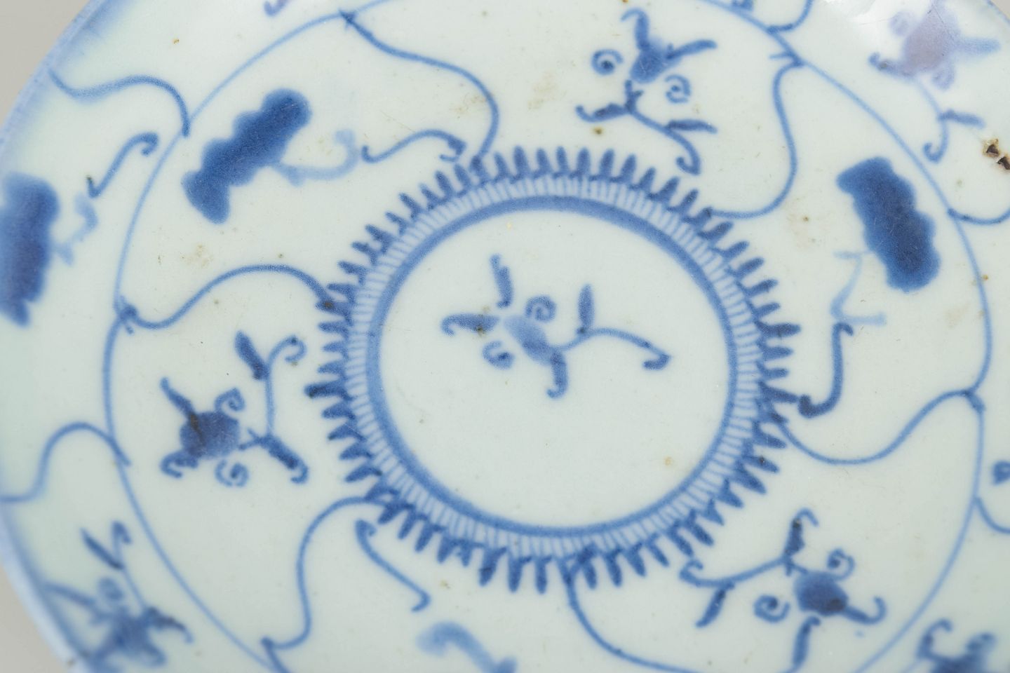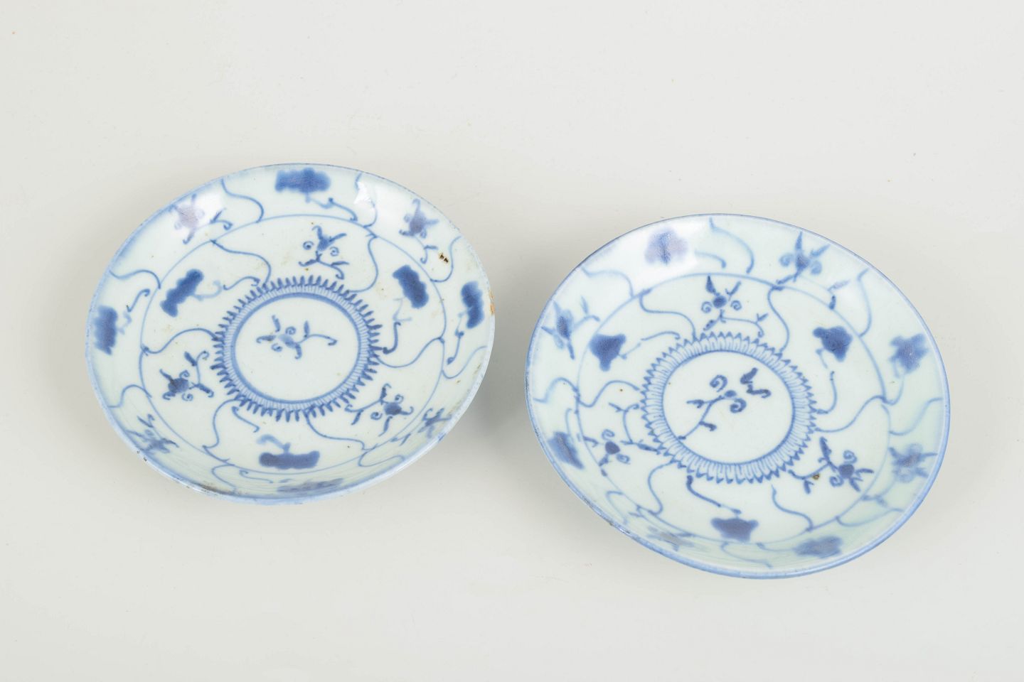 Pair of small white porcelain plates decorated in underglaze blue with floral and vine motifs, executed in the traditional Chinese style. Underside with double blue circle and square mark. Natural iron spots from 19th-century production.