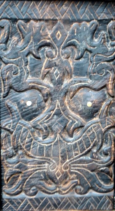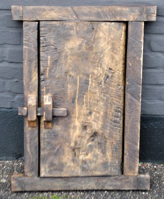 African wooden door with carvings. With bolt on the back. H: 71.5 cm. W: 53 cm.