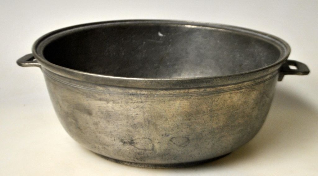 Antik gryde med to hanke i tin, 19. årh. Stemplet. Mestermærke og 44. H.: 8 cm. Dia.: 21 cm.