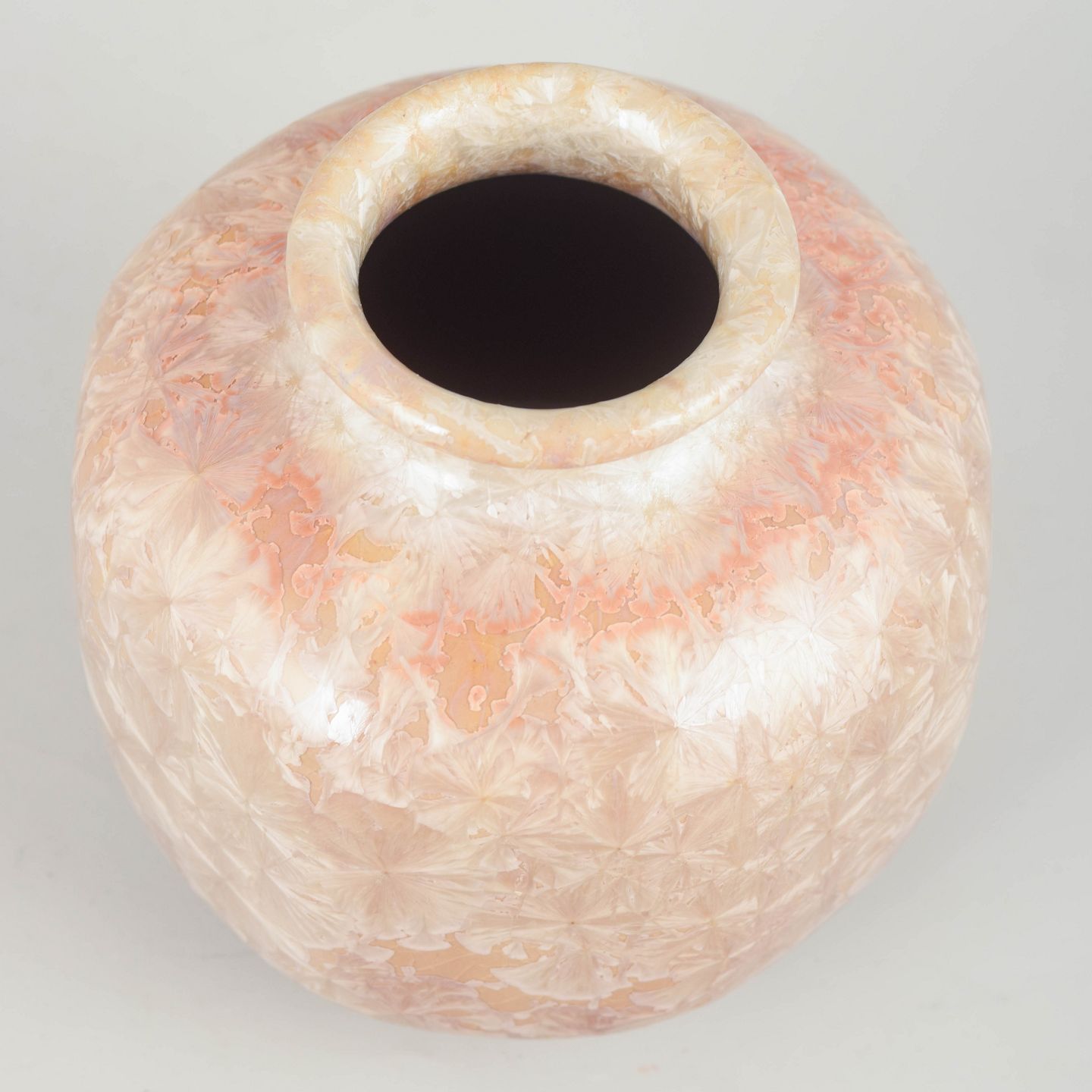 Lille, kompakt vase i kunstkeramik med karakteristisk krystalglasur i lyse rosa-, creme- og perlemorsnuancer. Den facetterede, krystallinske overflade skaber et levende spil af lys og struktur – et typisk træk ved tysk keramik fra perioden.