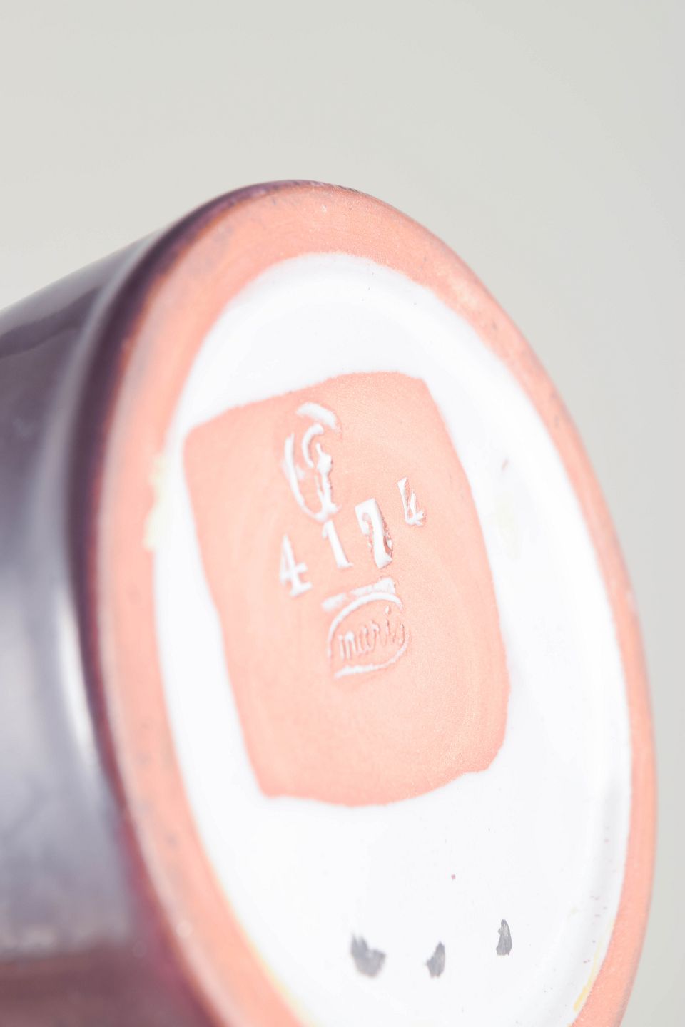 Mari Simmulson var en af Upsala-Ekebys mest betydningsfulde formgivere. I 1950’erne og 60’erne udviklede hun et ekspressivt formsprog præget af skulpturelle silhuetter, dybe farver og dekorative mønstre. Hendes arbejder blev udført i både serieproduktion og mindre oplag, hvilket gør mange modeller – særligt de større og mere skulpturelle som denne – eftertragtede blandt samlere i dag.