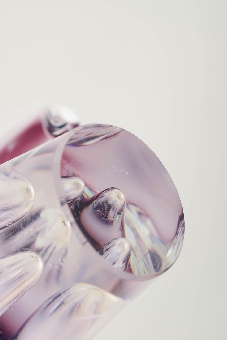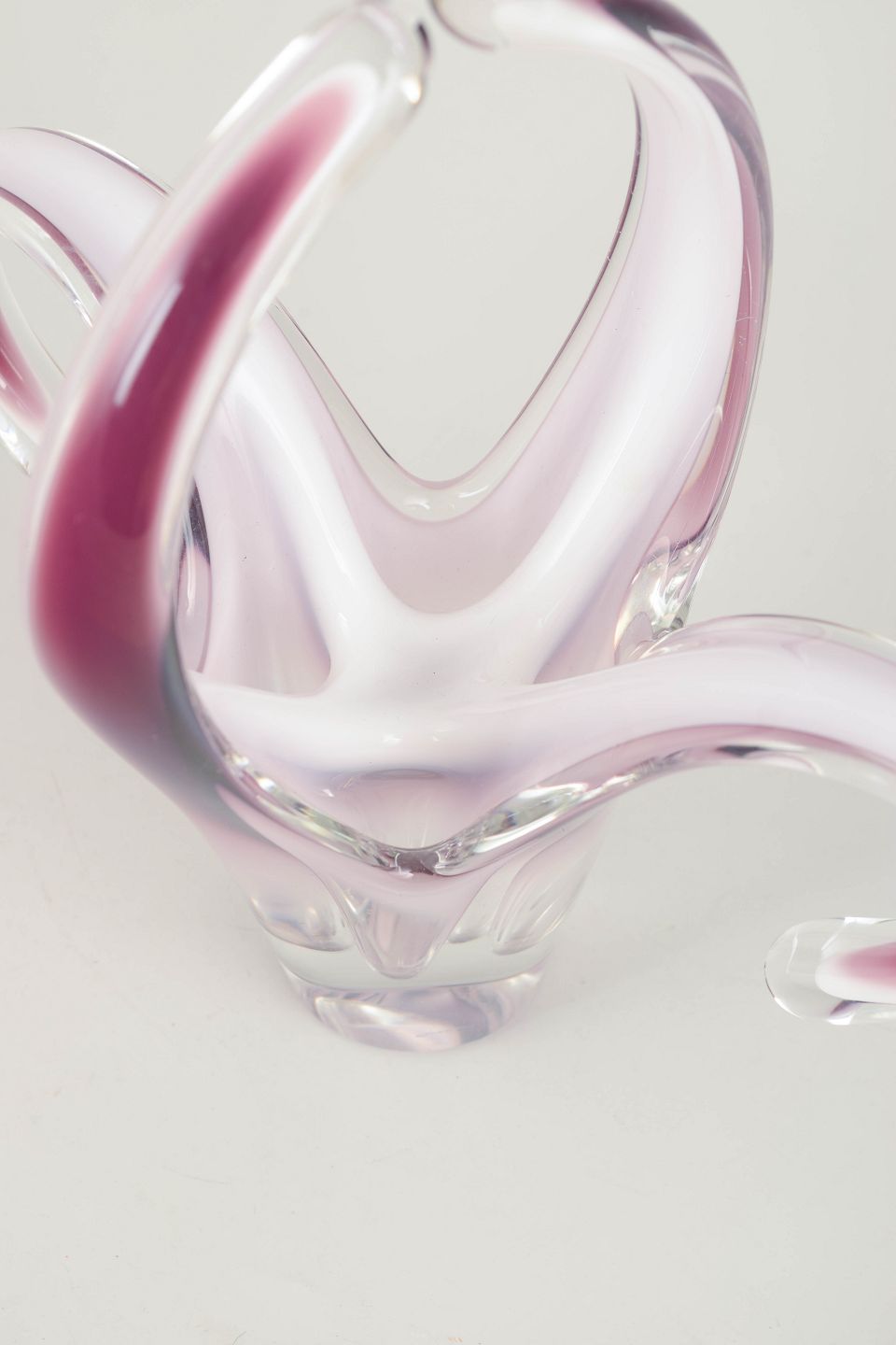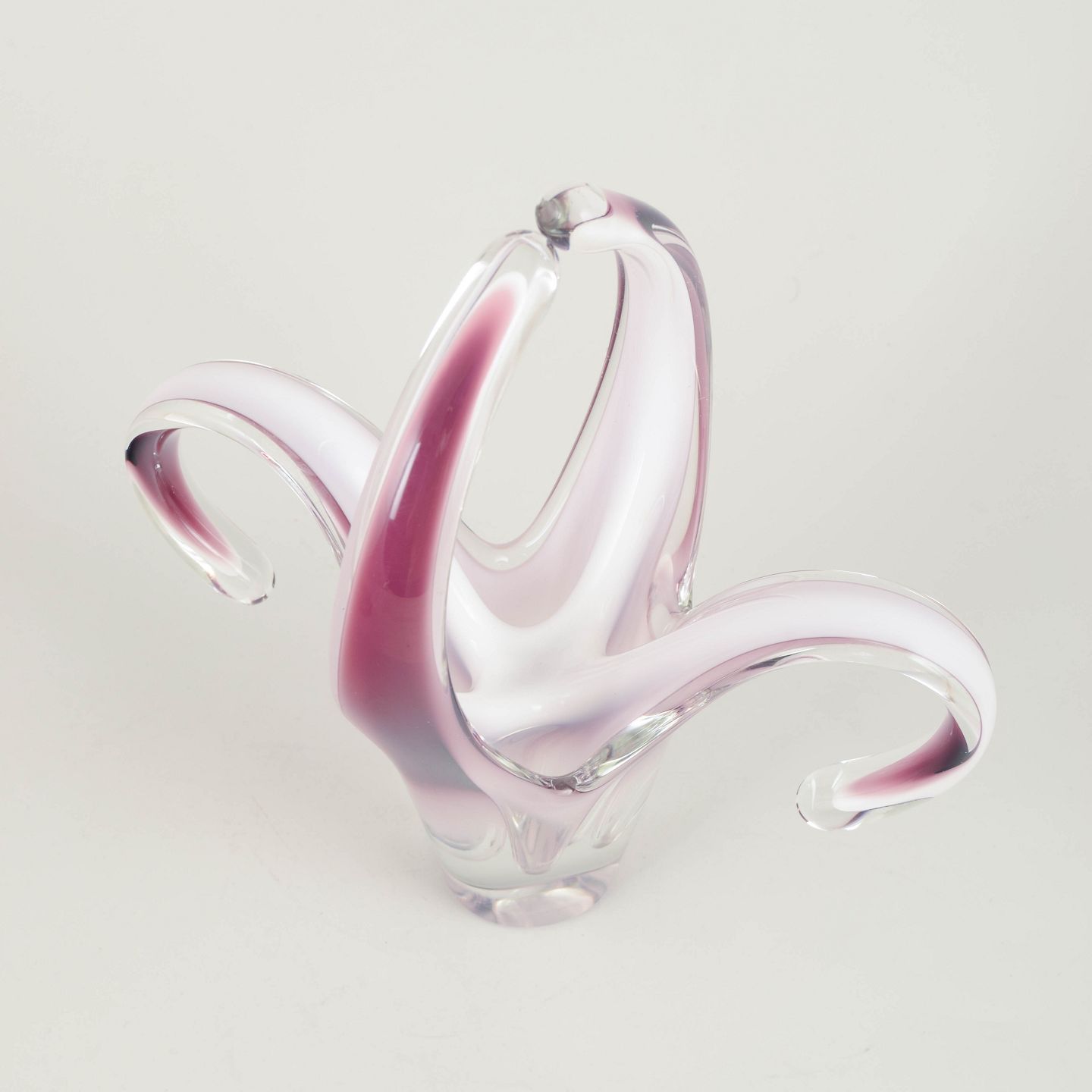Imponerende flerarms “Coquille”-skål i flerlaget kunstglas med rosa indfarvning, hvidt mellem­lag og klart yderglas. De tre svungne, opadstræbende arme giver et markant, næsten blomsteragtigt udtryk, typisk for Kedelvs mest skulpturelle arbejder.