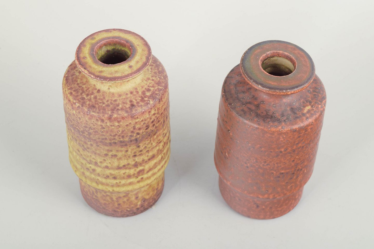 Pair of hand-thrown stoneware vases with the characteristic Mobach texture and matte, nuanced glazes in yellow and reddish-brown tones. The cylindrical forms and tactile surfaces are typical of the workshop’s modernist aesthetic.