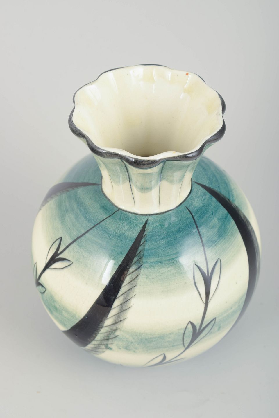 Art Deco-inspireret vase i glaseret fajance med håndmalet dekor i blå, grønne og sorte nuancer. Den svungne krop og riflede, udsvajede hals fremhæver periodens dekorative formsprog.