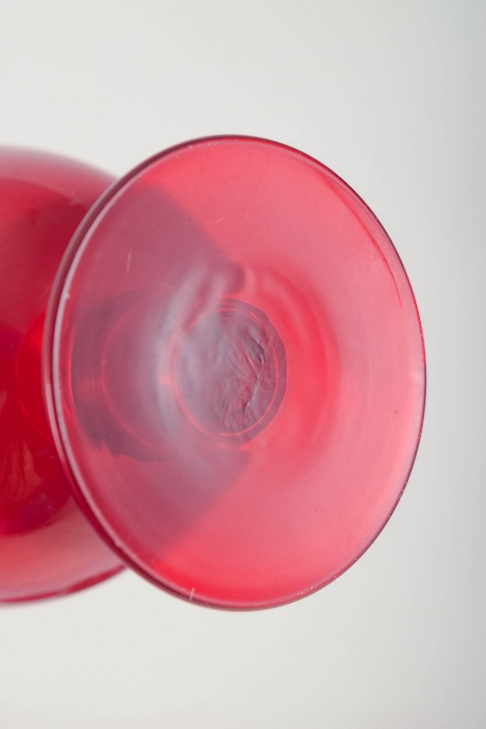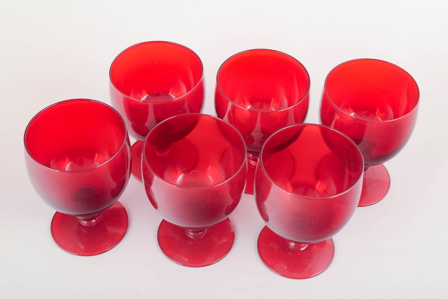 Set of six ruby-red red wine glasses with rounded bowls and profiled stems. The deep red colour is characteristic of Reijmyre’s mid-century production.