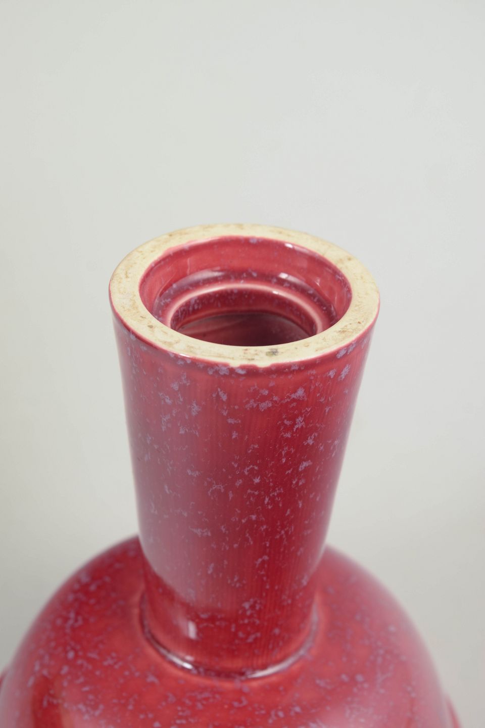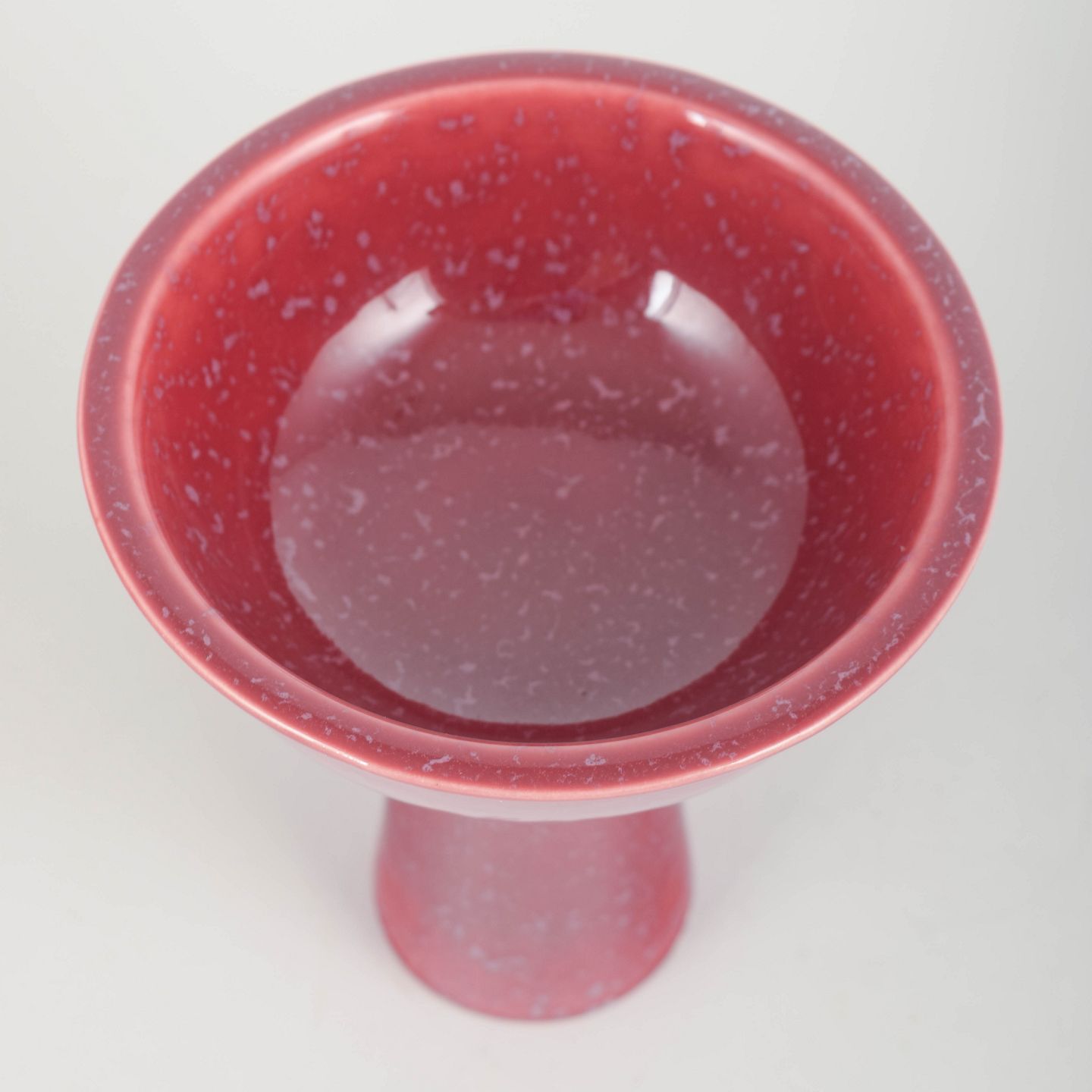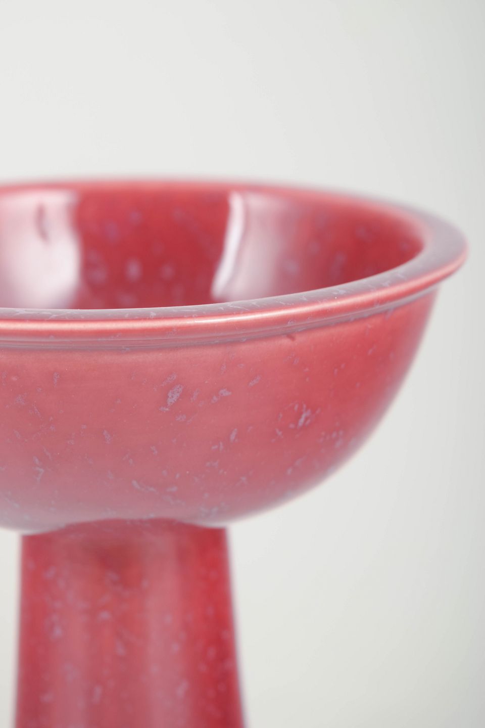 Sjælden pokalformet skål i rød glasur med blålige spejlinger, elegant høj fod og glat, afrundet form. Uden signatur.