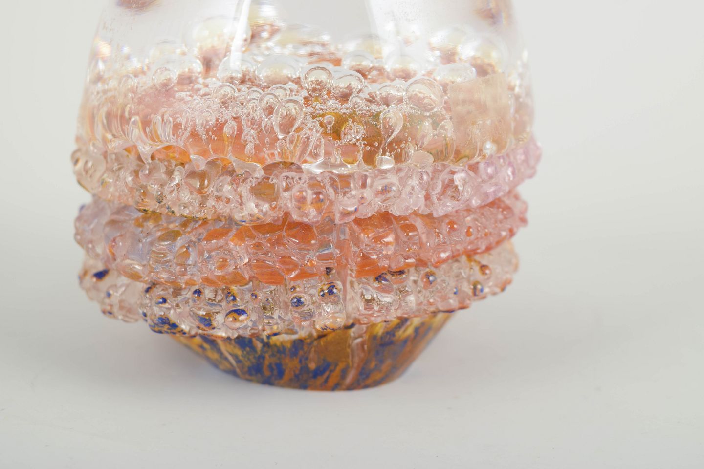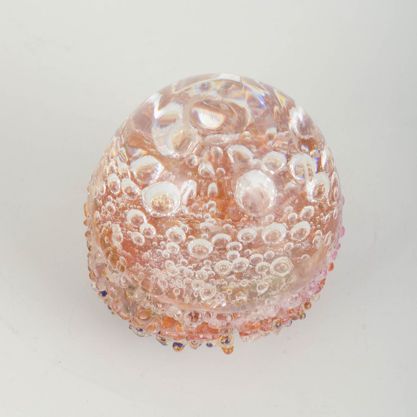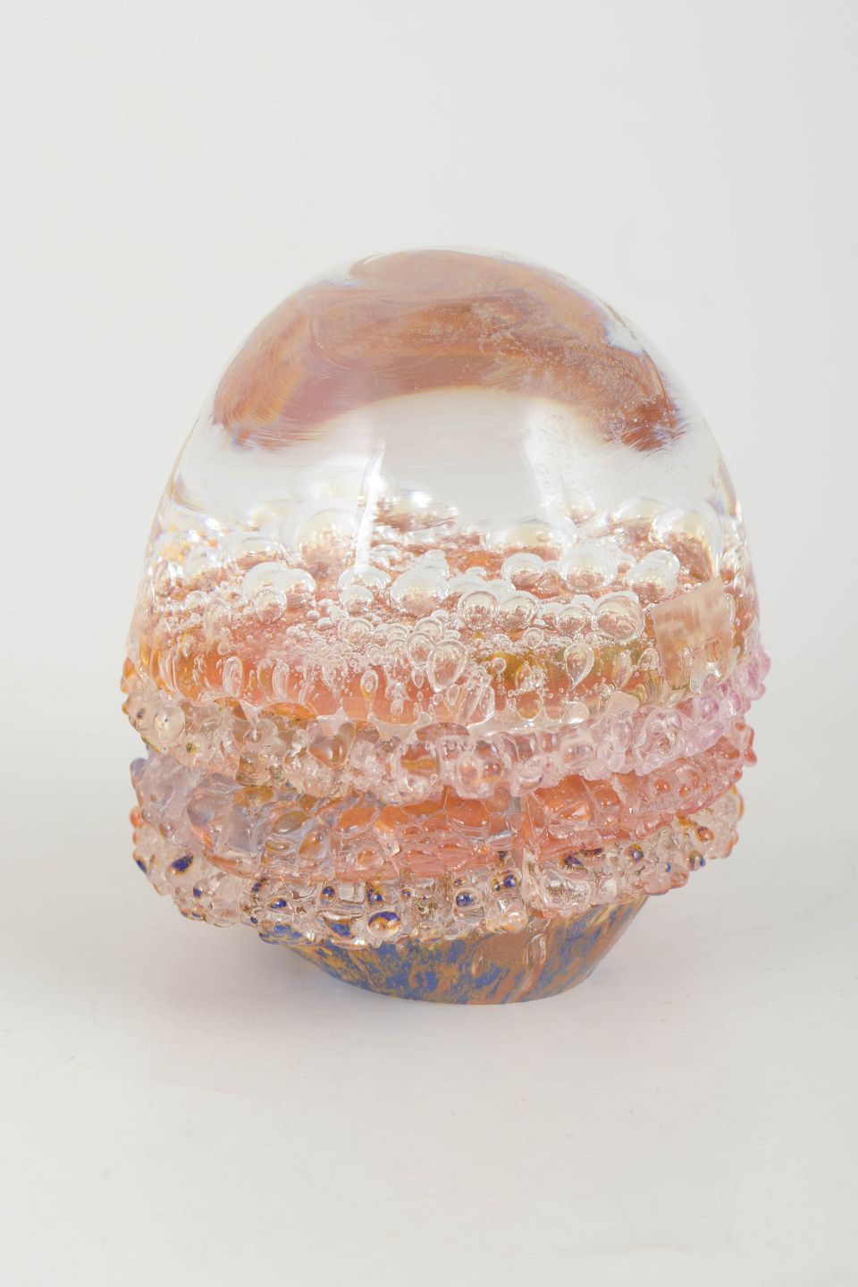 Organically shaped art glass object with encapsulated air bubbles and layered colour tones in pink, amber and clear hues.