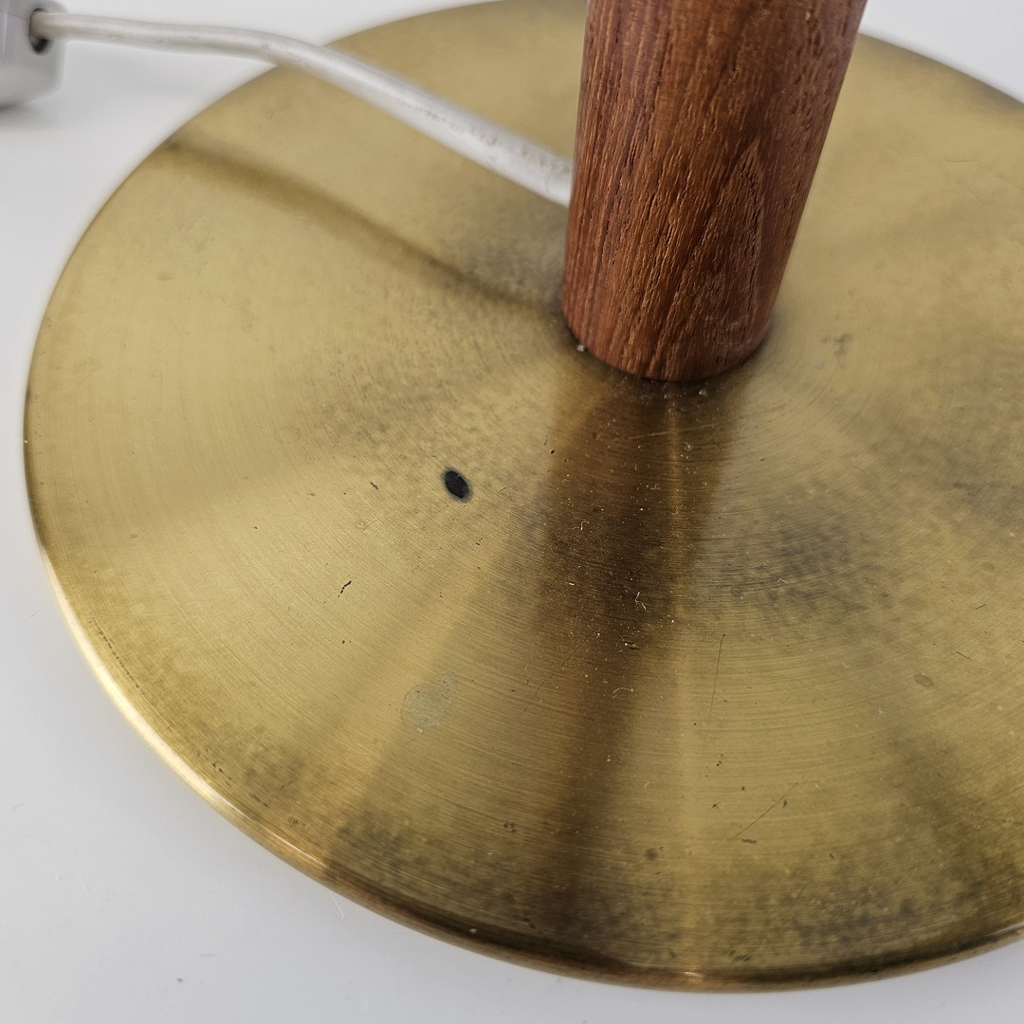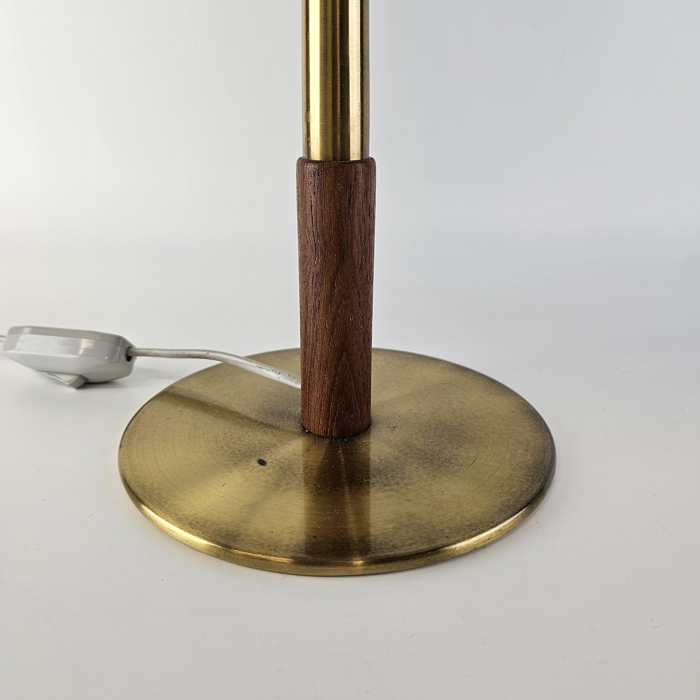 Bordlampe i messing med detalje af teak