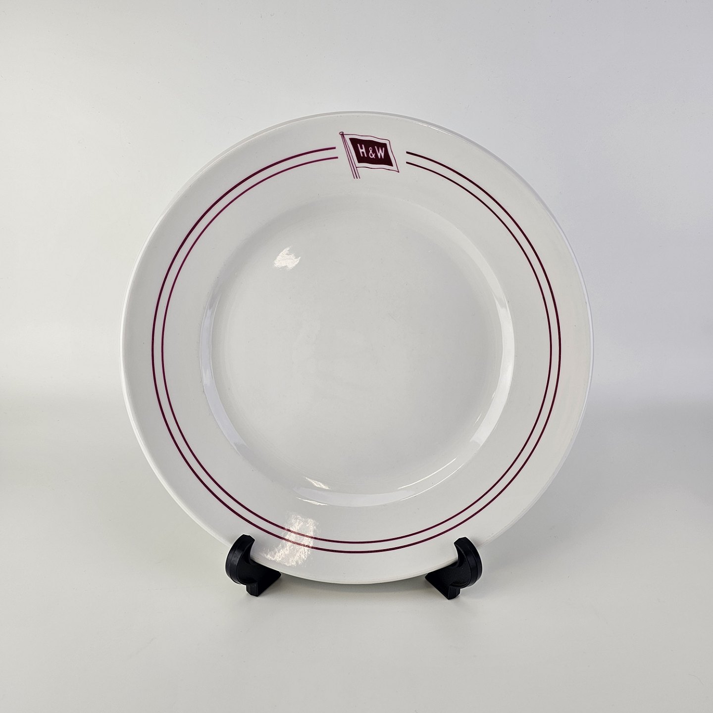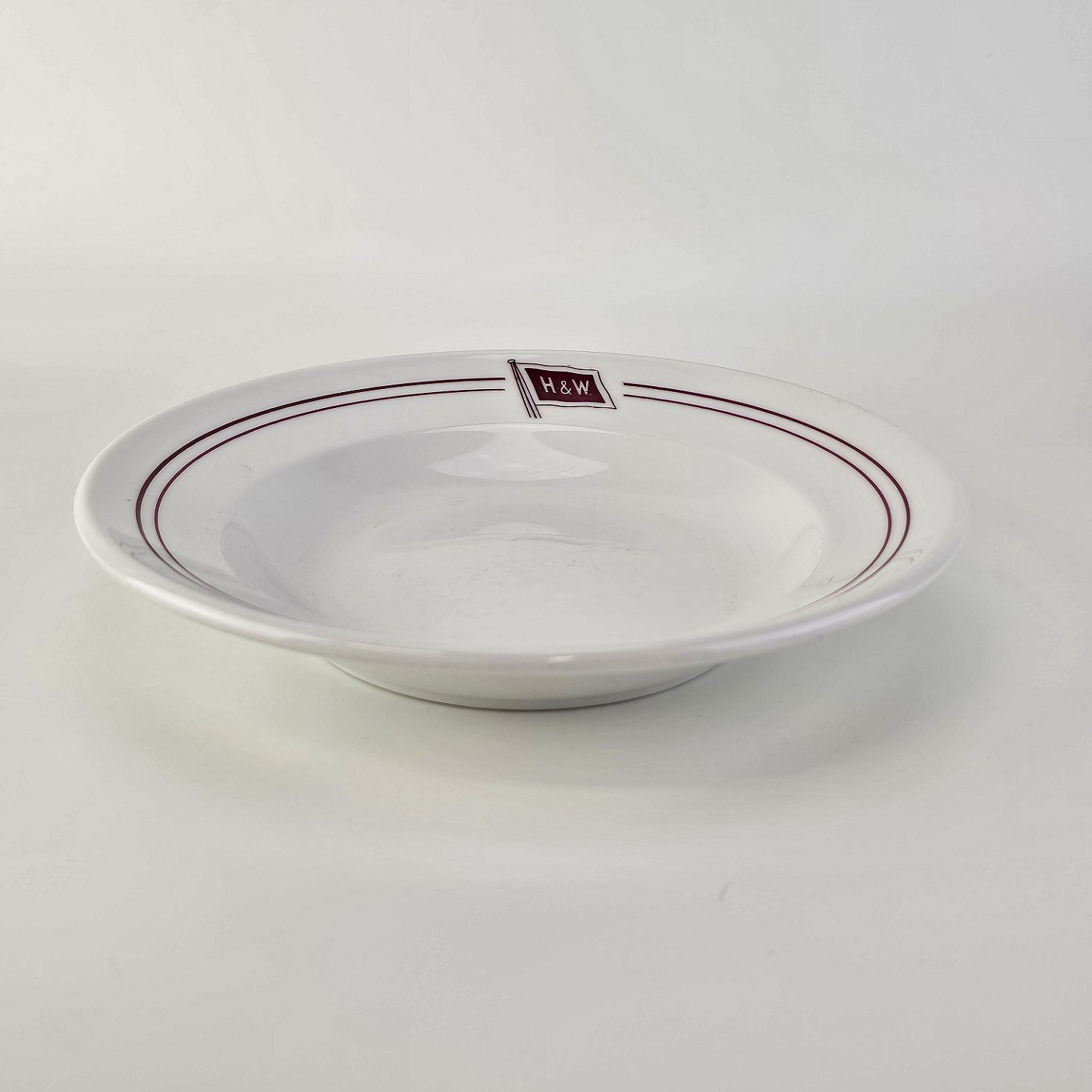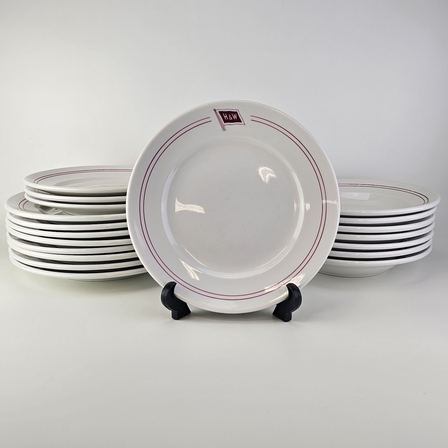 Sæt hotelporcelæn af flade middagstallerkener, flade frokosttallerkener og dybe tallerkener i kongeligt porcelæn dekoreret med røde streger og logoet for Holm & Wonsilds rederi