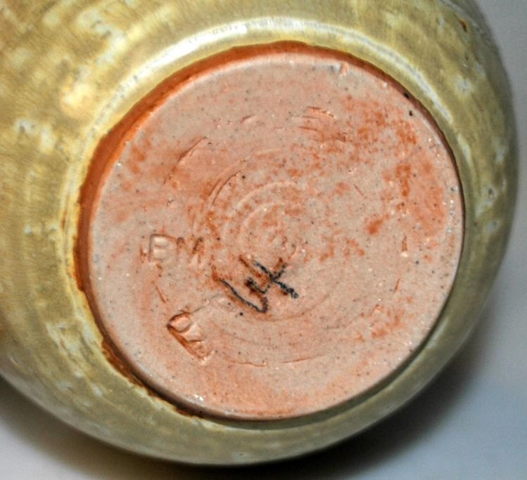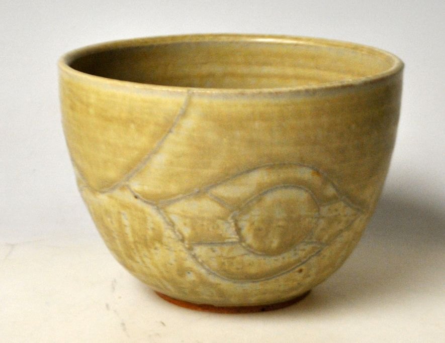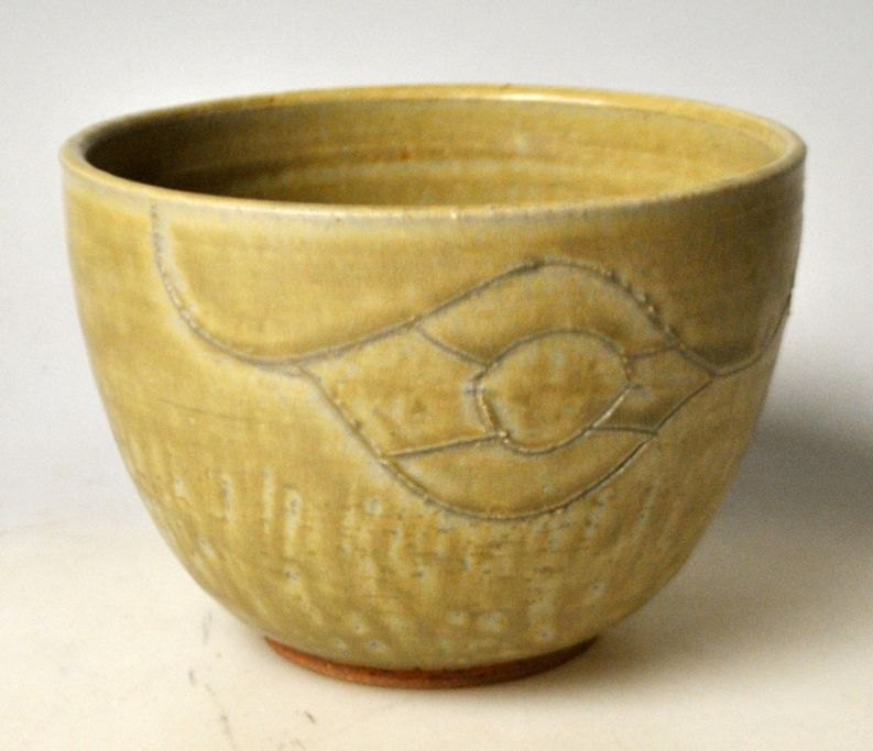 Hjorths keramik, 20. årh. Bornholm, Danmark. Unika skål. Stentøj. Med dekoration på siderne. Grågrøn glasur. Stemplet: B.M og mærke fra Hjorth. H.: 8 cm.