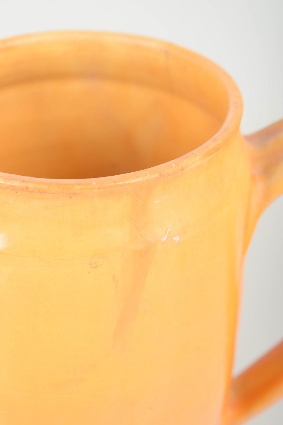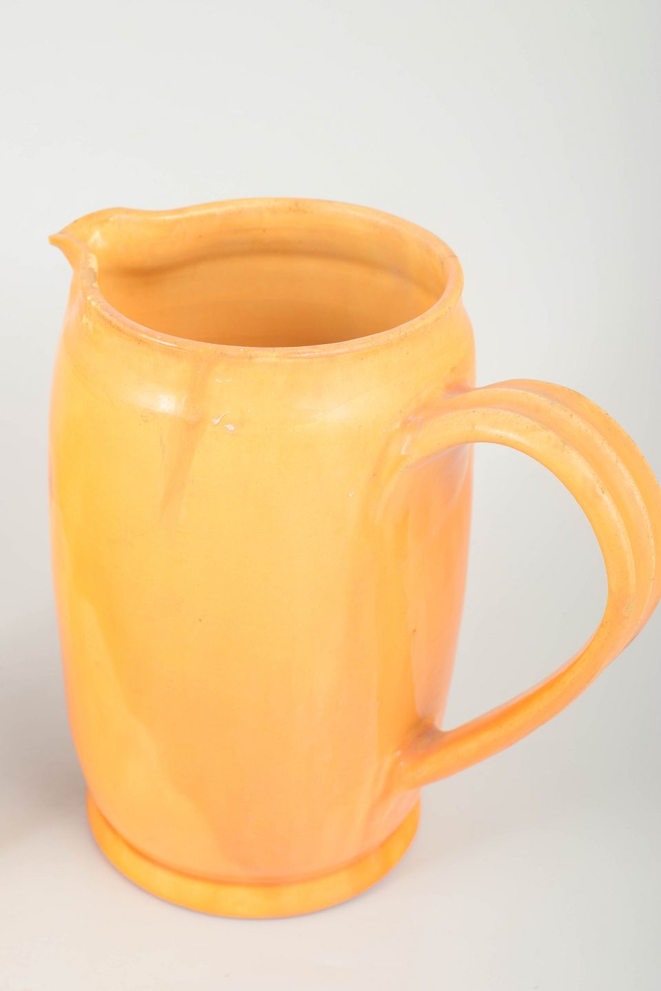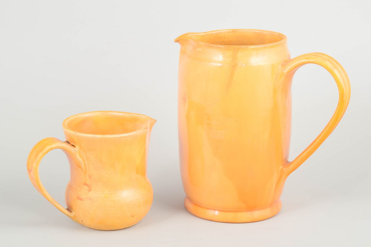 To store hånddrejede keramik-kander i Kählers karakteristiske gul-orange glasur fra 1930’erne. Begge med markante svungne hanke og blød cylindrisk form. Klassiske brugskrukker fra perioden.