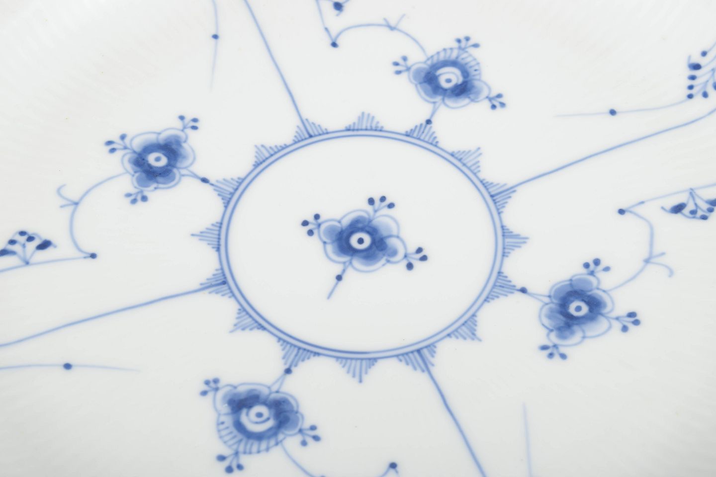 Stort og dekorativt serveringsfad i musselmalet riflet porcelæn, håndmalet i klassisk koboltblå på riflet korpus. Den brede, svungne form og det rige mønster gør fadet til et markant eksempel på Royal Copenhagens produktion i 1920’erne.