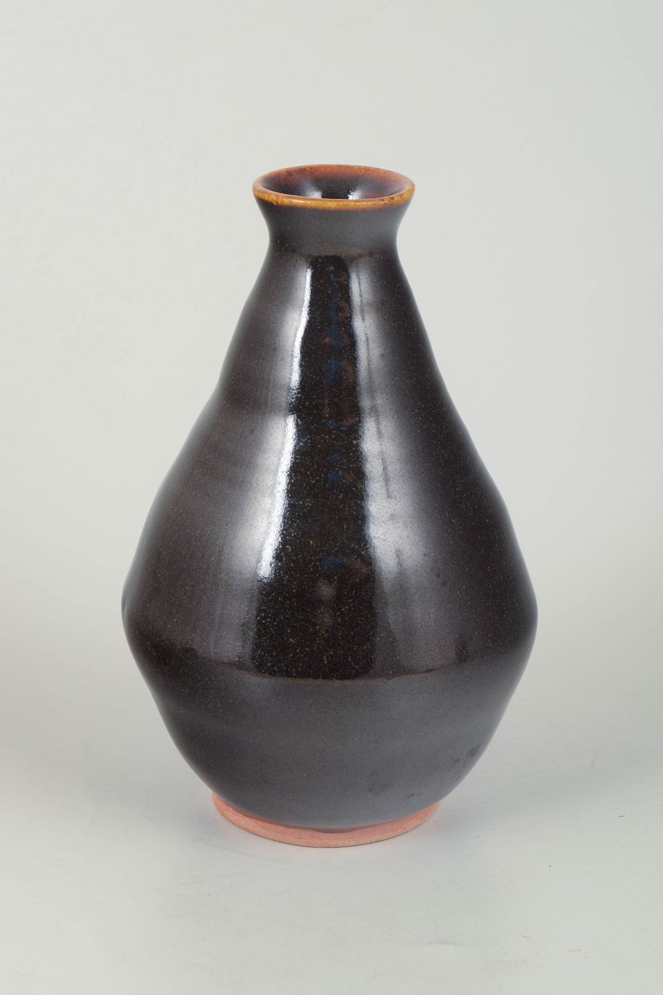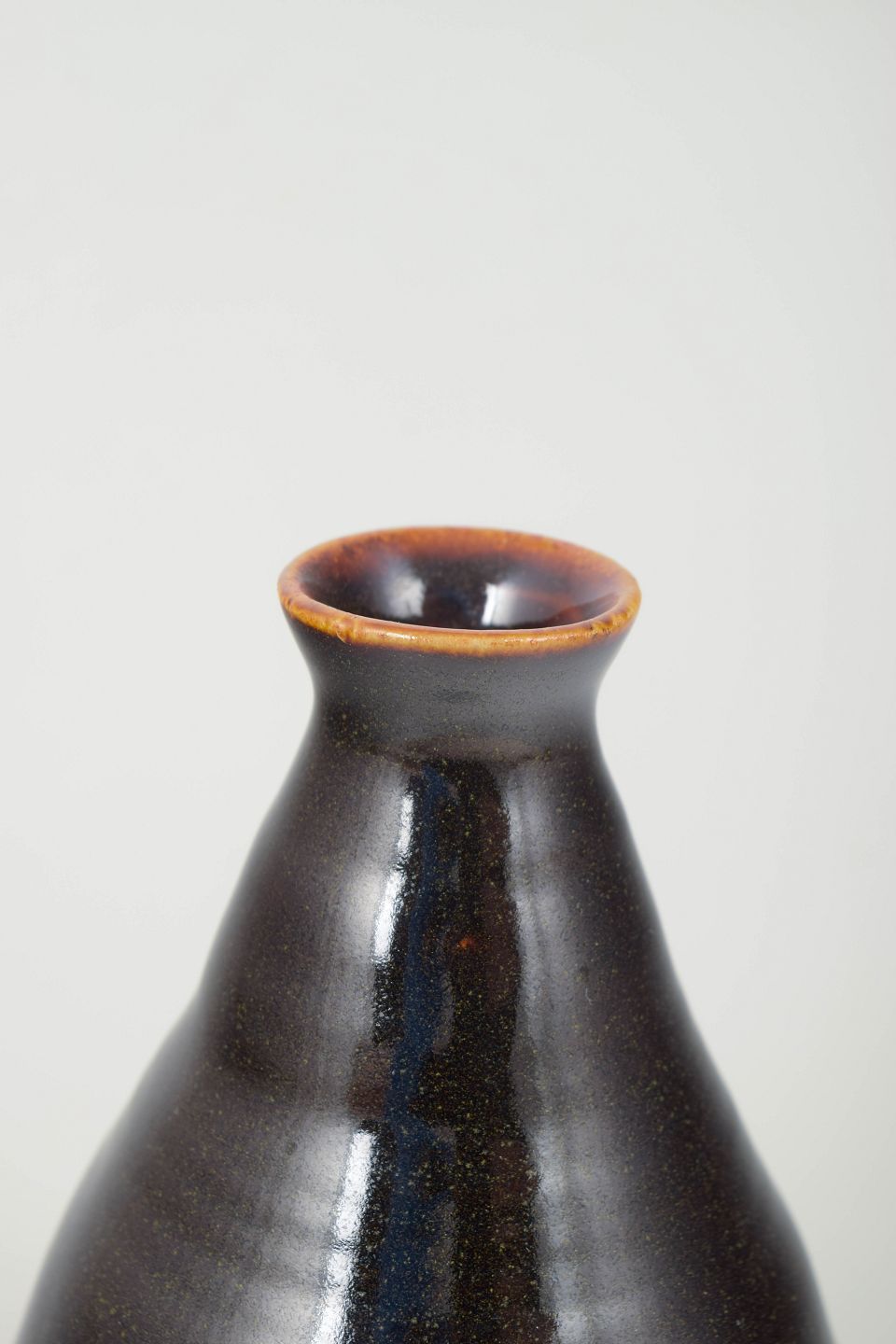 Hånddrejet stentøjsvase med elegant konisk profil, dækket af en dyb, mørk glasur med diskrete spil i overfladen. Et klassisk eksempel på Bornholmsk keramiktradition, hvor håndværk og enkle former går op i en harmonisk helhed.