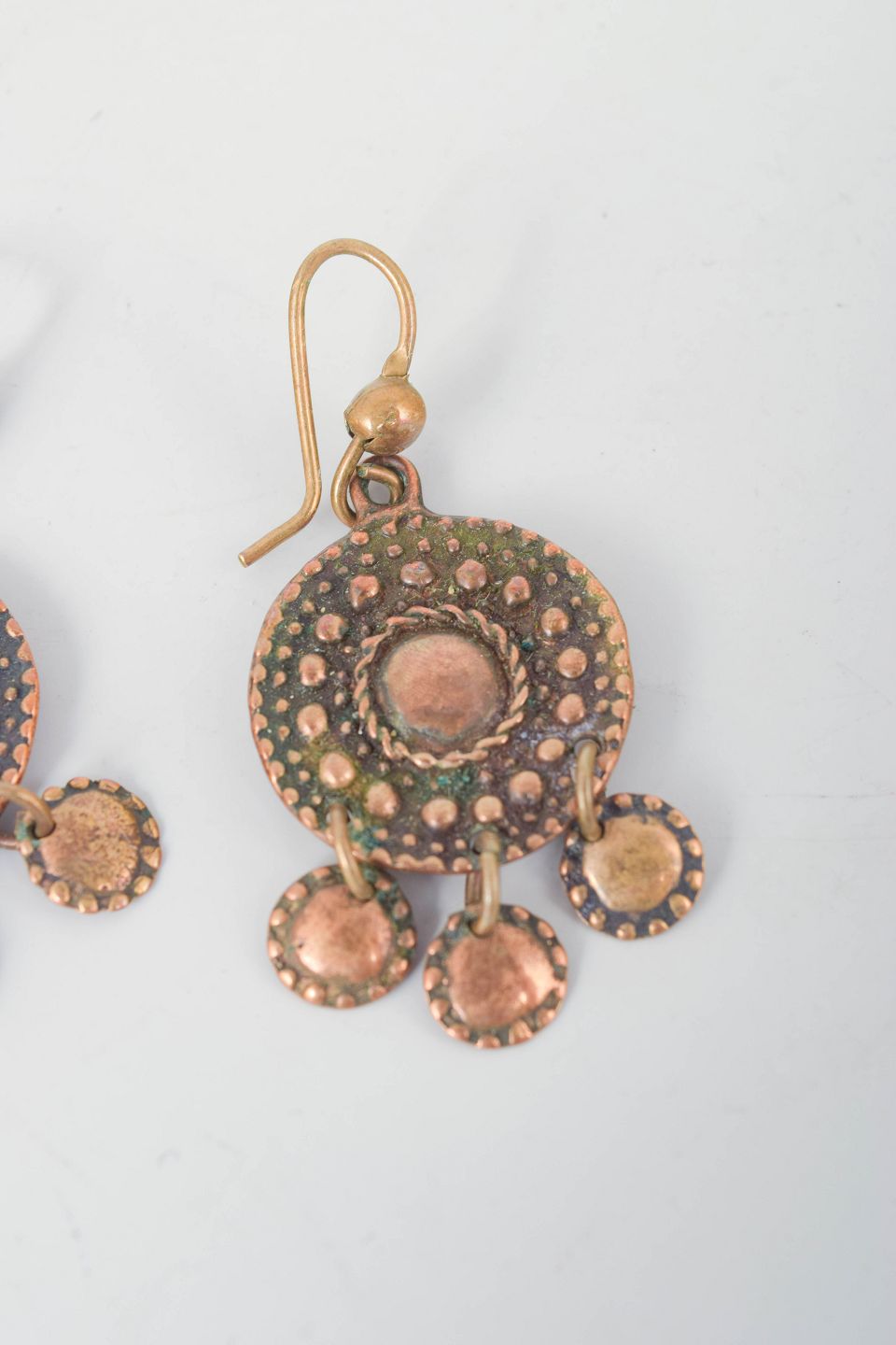 Par dekorative bronzeøreringe i Laine’s karakteristiske vikingeinspirerede, organiske formsprog. Ophængt medaljon med tre små dinglende elementer.